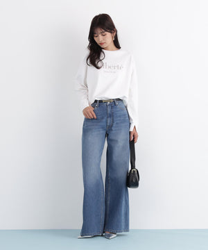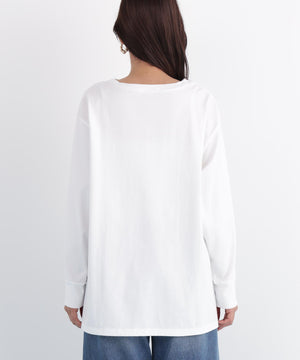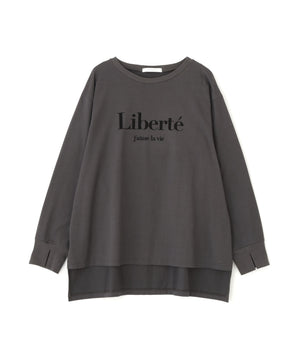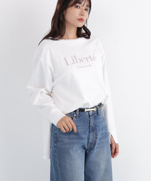 “Liberté j’aime la vie”(リベルテ、ジェム ラ ヴィ) はフランス語で「自由。私は人生を愛している」を意味し、「自由に、自分らしく人生を楽しむ」という前向きなメッセージを込めたTシャツ。ゆとりのあるリラックスシルエットで、程よい抜け感がデイリーに活躍する一枚。袖口リブにスリットを入れ、たくし上げた際も手元をシャープに演出します。前後差のあるヘムラインがフロントイン×バックアウトの着こなしに軽やかな動きを添え、シンプルながら洗練された印象に。