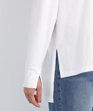 目がしっかり詰まったきれいな表面感で、カジュアルすぎず上品に見えるのが特徴のハイゲージ天竺。加工によって適度な光沢を加え、さらに程よいハリ感と肉感がシルエットを美しく保ちます。