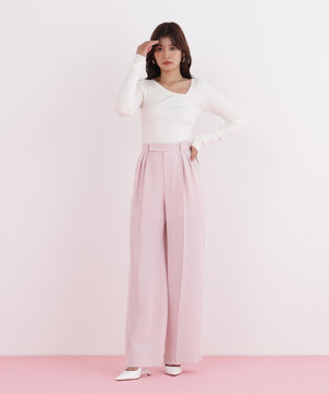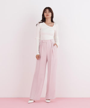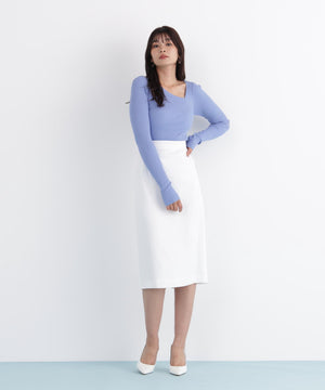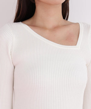 アシンメトリーなネックラインが顔周りをすっきり見せつつ、さりげない抜け感をプラス。