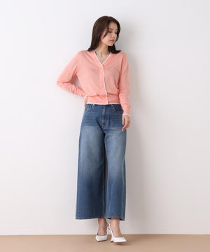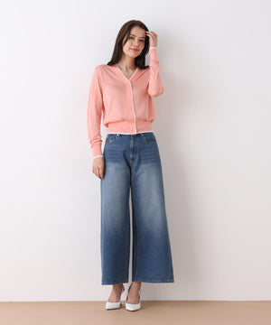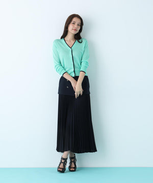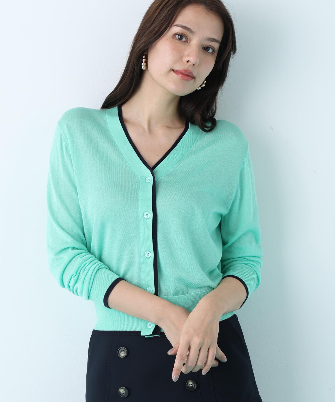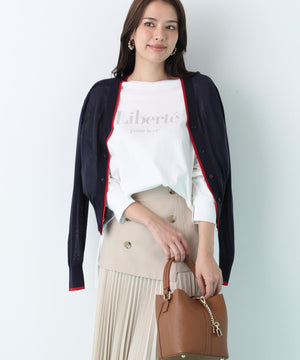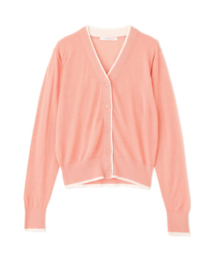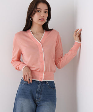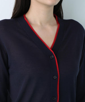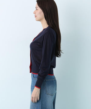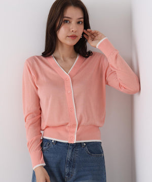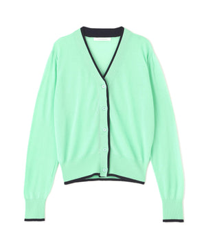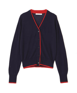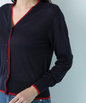 シンプルで定番的なデザインにポイントで効かせたライン配色が新鮮なVネックカーディガン。シャープ目なVネックの前立てとリブ部分に配色がアクセントをきかせる一枚。ストレッチ性のある薄手で柔らかい編地で身体離れする素材感のカーディガンはシーズン長く着用いただける汎用性の高いアイテム。