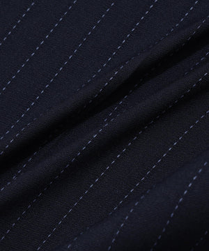 素材は高級感のあるツイル組織にピンストライプ柄で、ヴァージンウールの混紡糸にストレッチ性を持たせた快適な質感。