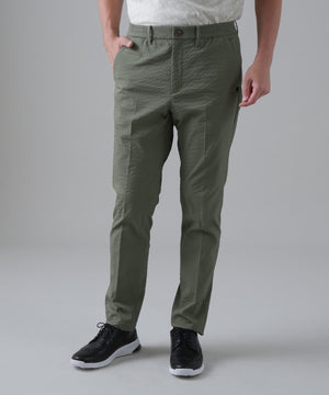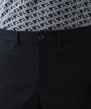 伸縮素材のEXストレッチvisionを使用し た、ドットストライプジャカード レギュラーテーパードパンツ。