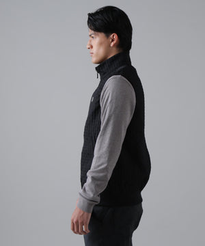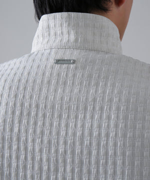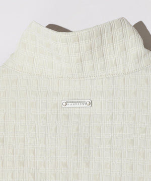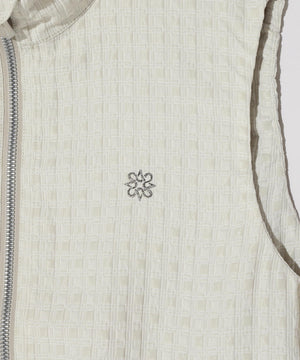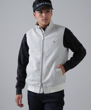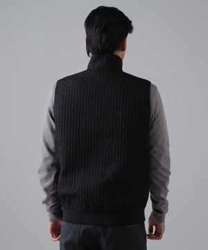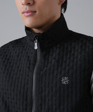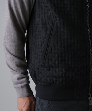 伸縮性の違う2タイプの糸を使用して立体的なフクレの表面感を出した、二重織のふくれジャガードのフルジップベストです。