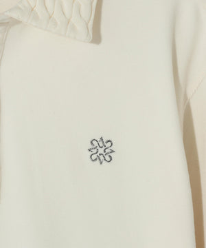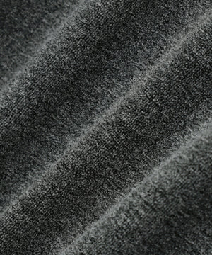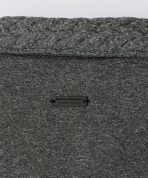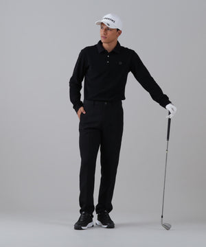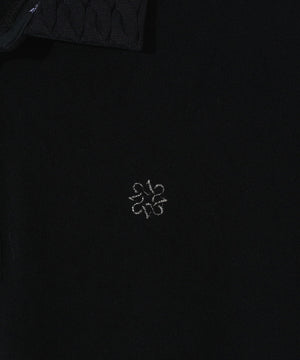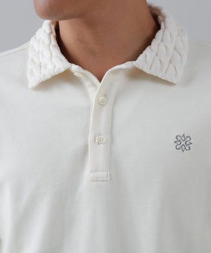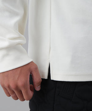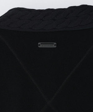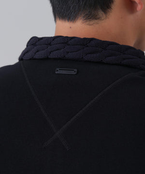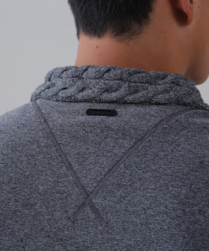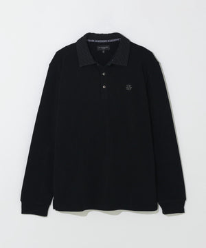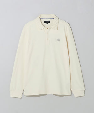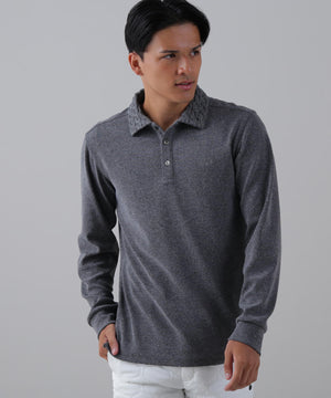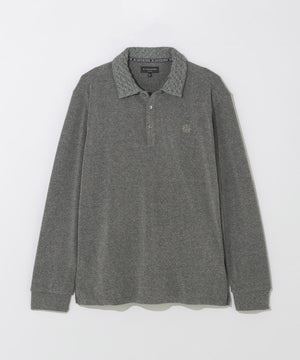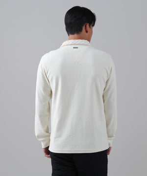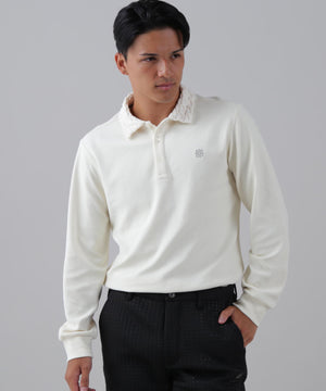 襟にケーブルニットを使用した立体的なテクスチャが豊かな表情を与える、パイル長袖ポロシャツ。