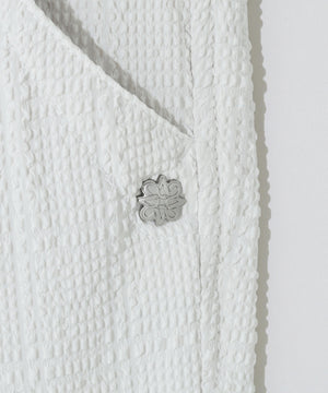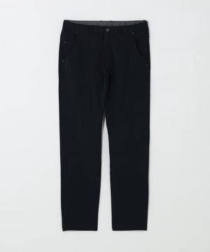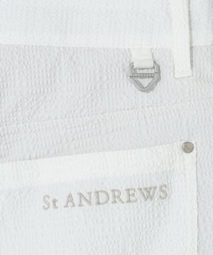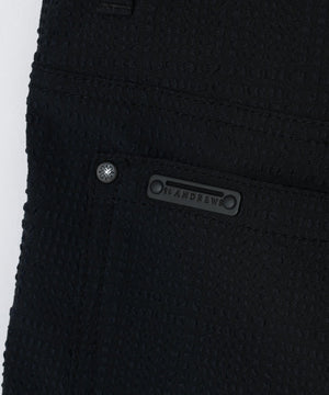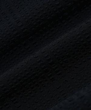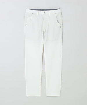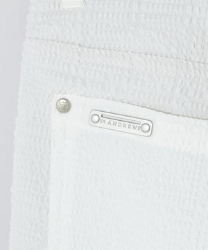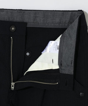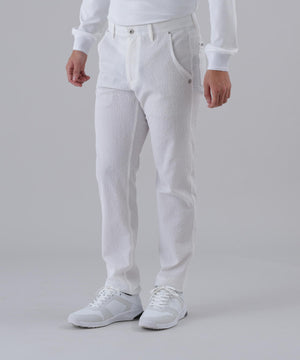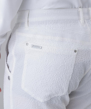 シンプルなパンツのサッカー生地表面の凹凸にさらに豊かな表情をつけた、変形サッカー5ポケットパンツ。
