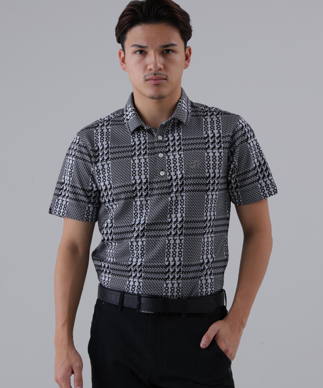 エレガントなライフスタイルを想起させる、馬具や馬柄などを組み合わせて構成されたシックな雰囲気の半袖シャツです。