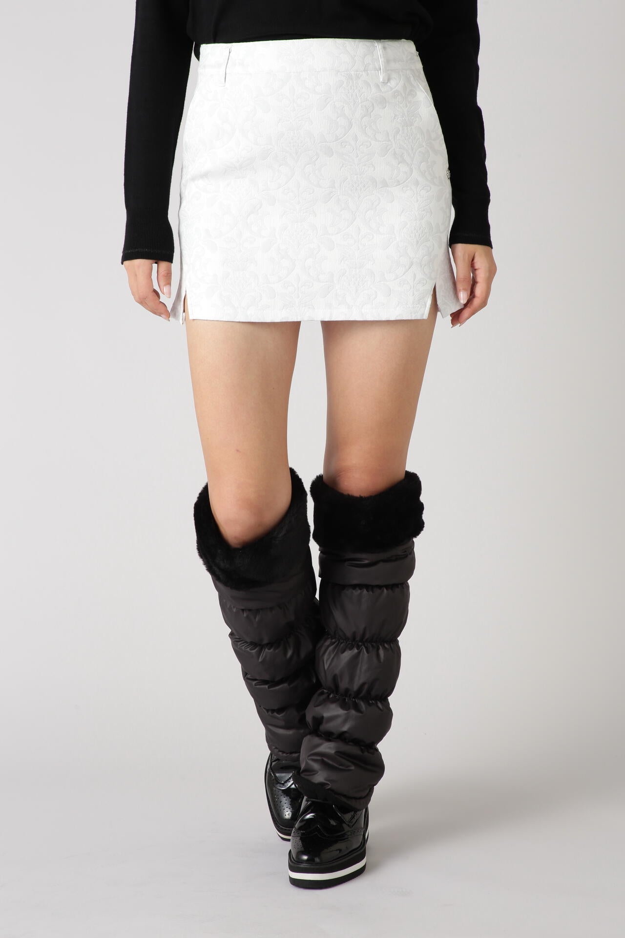 快適性を追求しつつ大人っぽくゴージャスにデザインした、ゴシックダマスジャガードストレッチスカート。シーズンらしいやや肉厚のしっかりとした、雰囲気たっぷりのジャガード生地を使用しています。はいた時に美しいシルエットを生み出す、裾に向かってやや広がりを持たせたAラインシルエットを採用。さらに、脚の動きを妨げないポリウレタン混による高いストレッチ性と、防風効果と保温性をもたらす裏生地付きにより寒い冬場のコースでも快適に過ごせます。着こなしに抜け感を裾のスリットや、随所に施された高級感を与えるメタリックのモチーフがさりげないアクセントになっています。