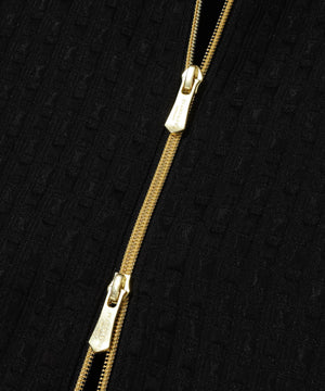 ゴールドのファスナーディテールや合成皮革のベルトがコーディネートのポイントになる、フクレジャガードブルゾン。