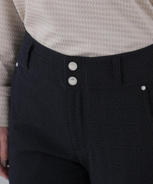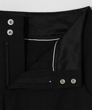 ウエストマークが叶うふたつのフロントボタンがポイントの、変形サッカー5ポケットパンツ。