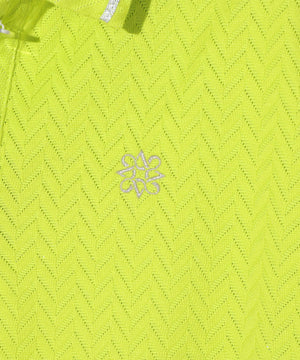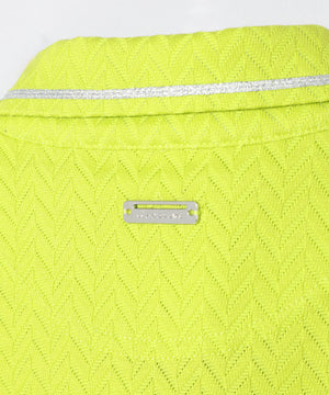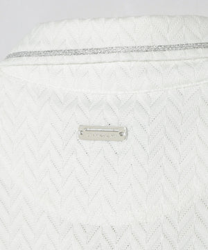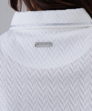 襟元に入れたラメのラインでキラキラの存在感を与えた、ヘリンボーンジャガード半袖ポロシャツ。