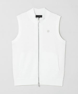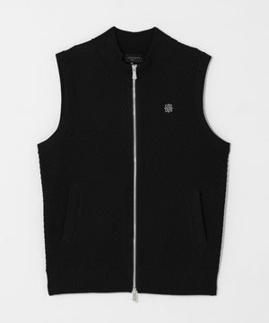 前後の身頃の編地を変えてさりげない遊び心をプラスした、ジップアップニットベスト。