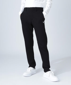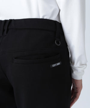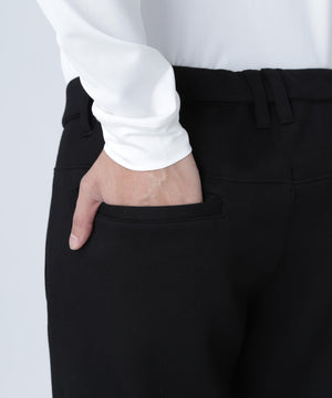 伸縮性の良い素材や楽にはけるゴムウエストを配置しながら、カジュアルになりすぎないシックにもスポーティーにも使いやすいパンツになっています。