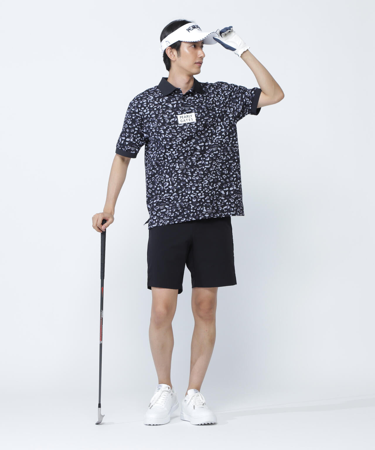 ベーシックな印象の着こなしにパッと目を引くスパイス効果を発揮する、ヒョウ柄格子ジャージ半袖ポロシャツ。