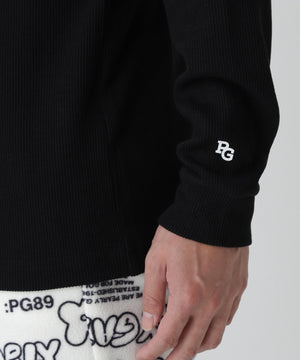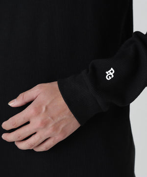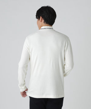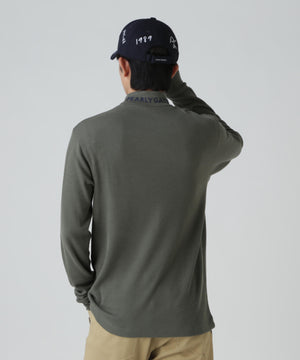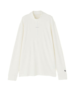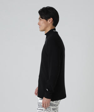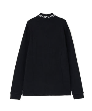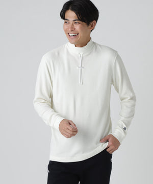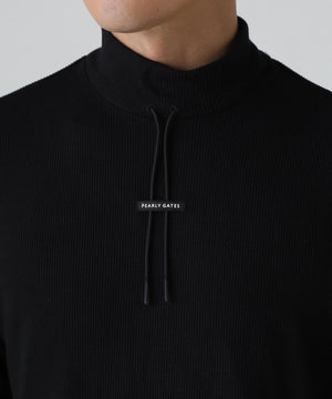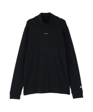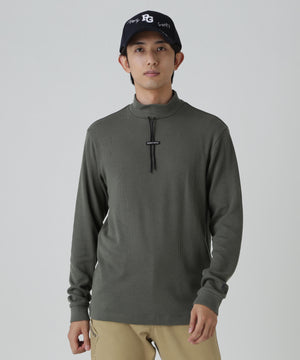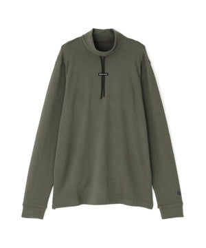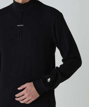 ロゴやドロスト紐で首元にデザイン性を与えた、セルヒートリブフェイス長袖モックネックカットソー。