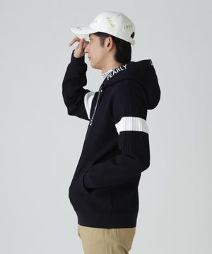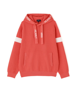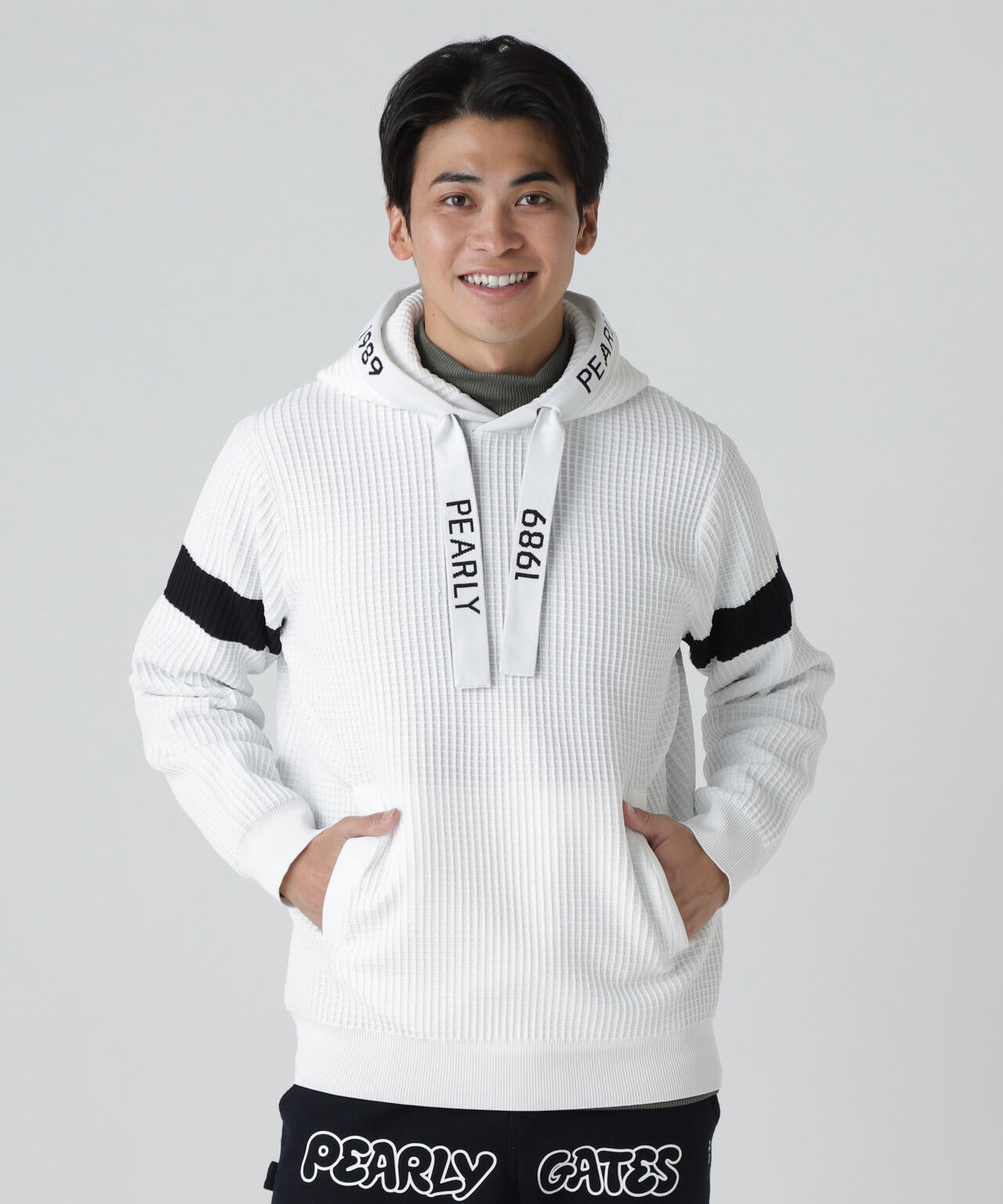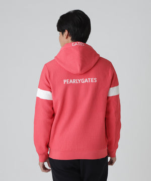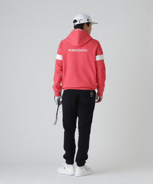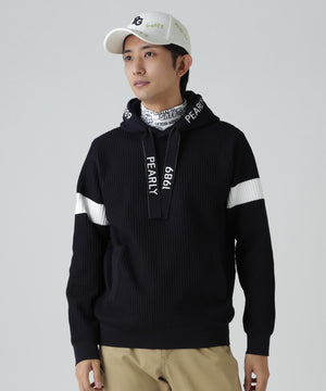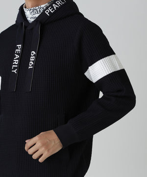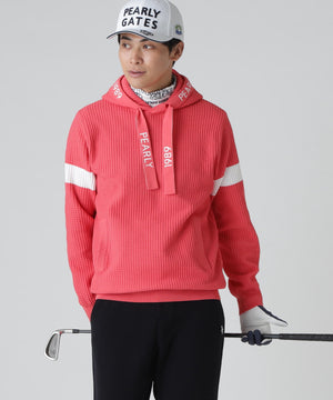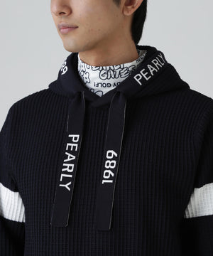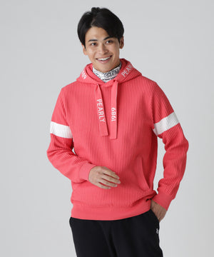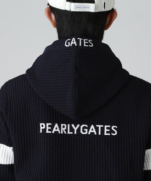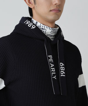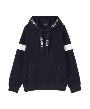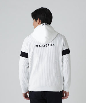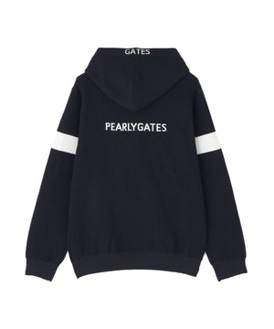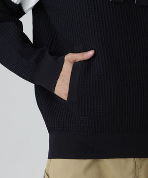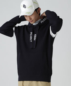 格子状の凸凹がある繊細な編地にPGロゴを入れてスポーティーを表現した、12Gダブルジャガードフーディニットプルオーバー。