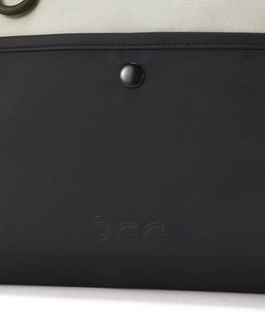 ゴルフのラウンド小物をまとめて収納できるちょうど良いサイズ感のバッグに、大きく開くダブルジップのファスナー口部を配置した配色使いのインナーをレイヤードさせたアイテムです。