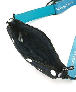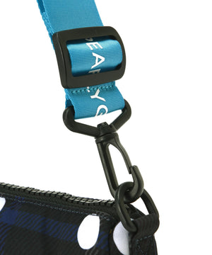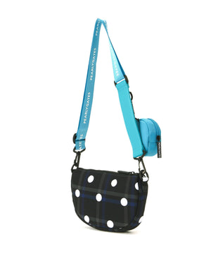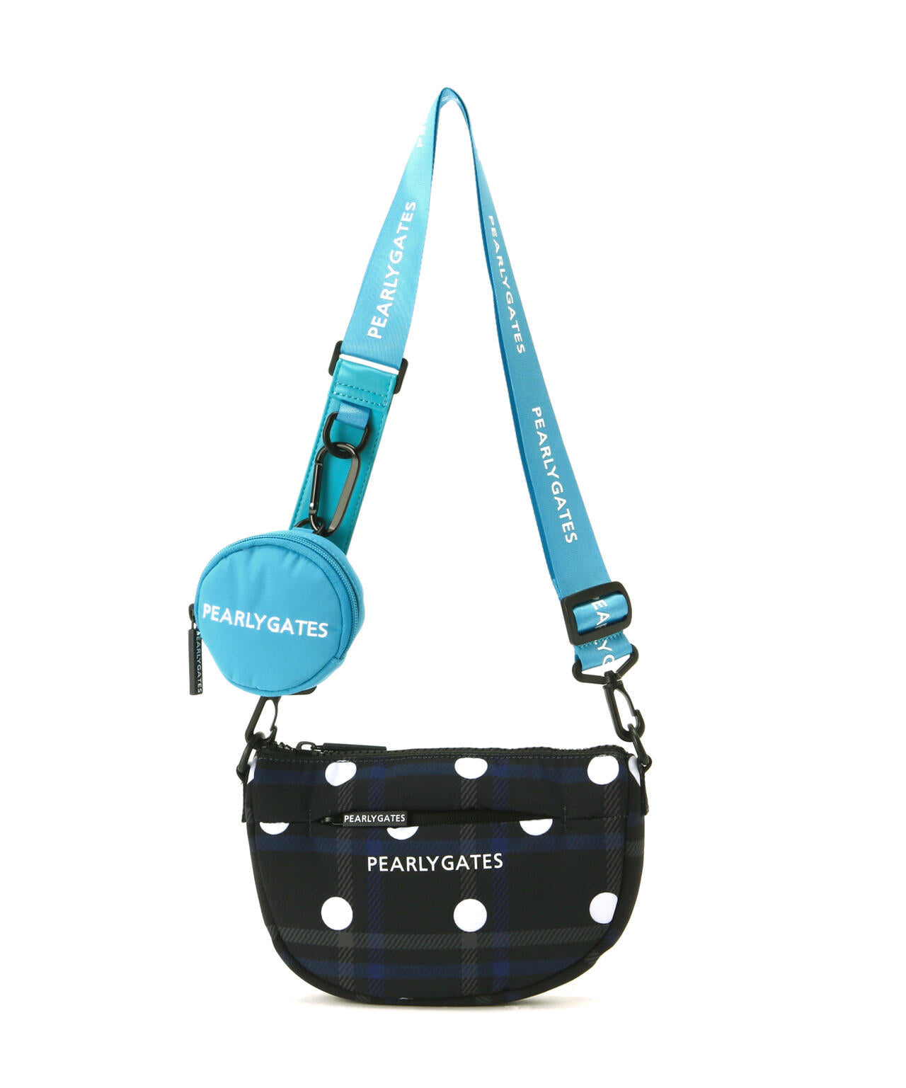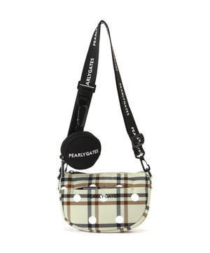 配色使いのショルダーベルトやポーチがコーディネートのポイントになる、チェック×ドット柄中綿マルチポーチ。