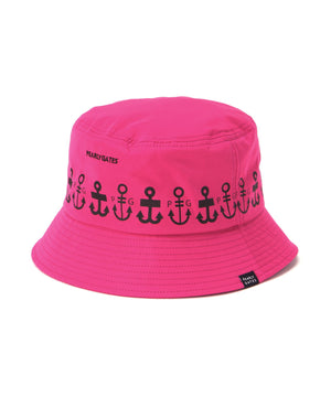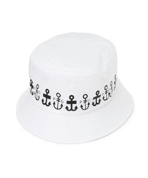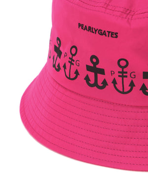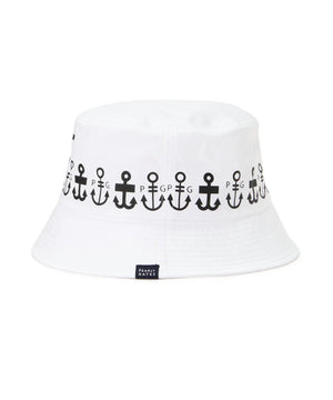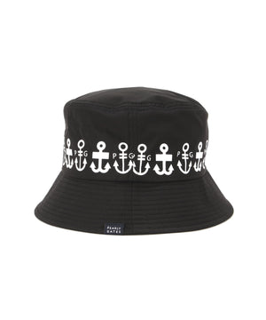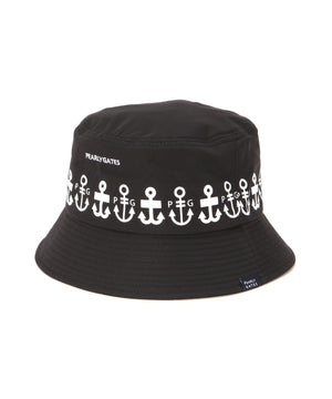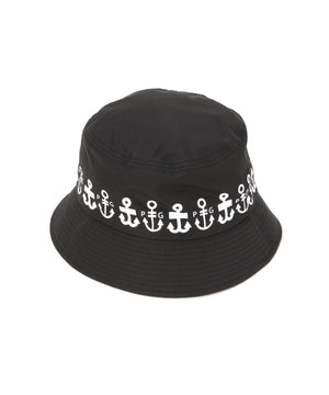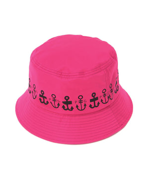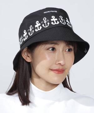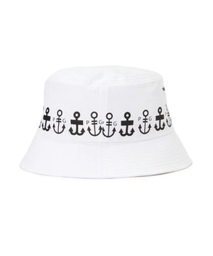 顔や首元を紫外線から守るのに効果的な紫外線遮蔽率90パーセント以上の生地を使用した、クラウンにロゴアンカー柄を施したシンプルなバケットハットです。