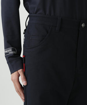 タテ糸に綿と、ヨコ糸にリサイクルポリエテルルの「RENU」を使用した、畝がある表面感が特徴のカルゼ組織で織ったストレッチ素材を使用したパンツです。