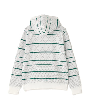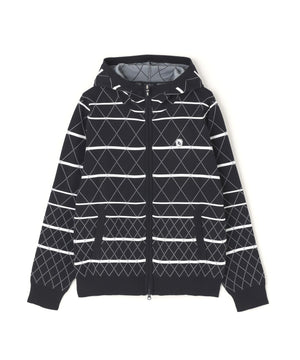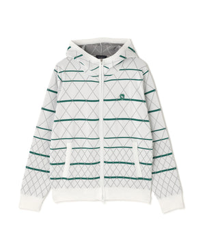 特殊な編み方で立体感を生み出した、キルト風袋ジャガードフルジップニットフーディ。