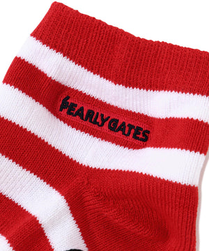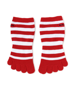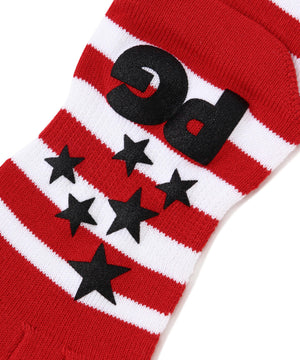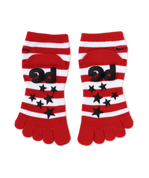 存在感のあるPOPなフォントのPGロゴとスター柄の足底ラバーを配置した、5本指ボーダーショートソックス。