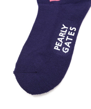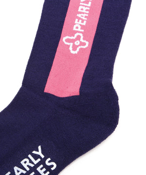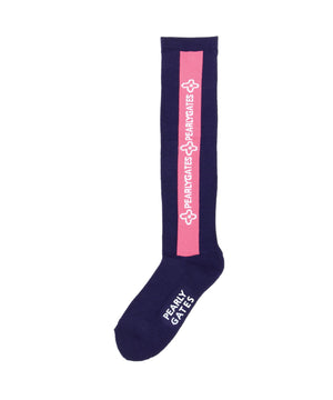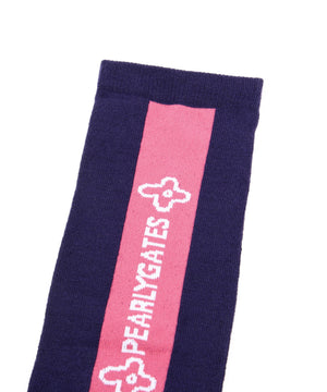 ロゴとフラワーを組み合わせたサイドラインの色使いと絶妙なバランスで足元からこなれ感をプラスできる、ロゴラインハイソックス。