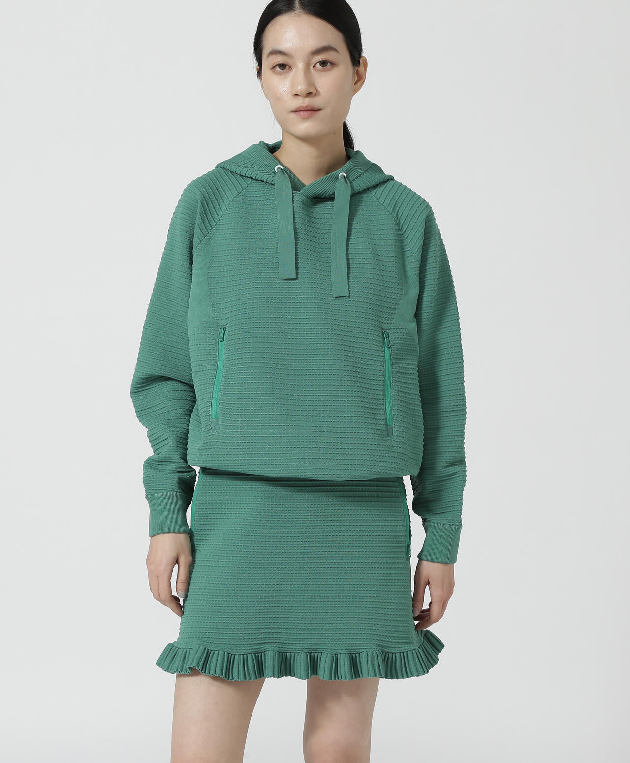 巧みに変化させた編地と構造で快適な立体シルエットに仕立てた、ポリエステルヤーンmmニットフーディプルオーバー。丈夫で耐久性が高く、摩耗や引き裂きに対する抵抗力がありつつ、滑らかな肌触りの良さが快適な着心地を生み出すキレイな表面感が特徴の素材を使用。しなやかさと適度なハリコシを併せ持ち、長時間の着用でも型崩れしにくく美しいシルエットをキープします。肩や腕周りの動きが快適になるラグランで切替えした少し大きめのアームホールに、今っぽさの表現とリラックスして着れる抜け感のあるシルエットを採用しています。フロントには、ラウンド小物などを携帯できるファスナーポケットを付けて収納性を高めた作りです。ニットならではの伸縮性の良さと上品さでゴルフやアウトドアはもちろん、デイリーユースでも着たくなる大人のストリートコーデに打って付けのアイテムです。同素材でご用意のあるスカートとの、セットアップコーデで着こなすのもおすすめです。
