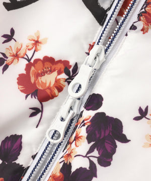 軽い着心地で柔らかさと暖かさを感じる、繊細花柄Peミニリップ中綿ジップアップブルゾン。
