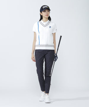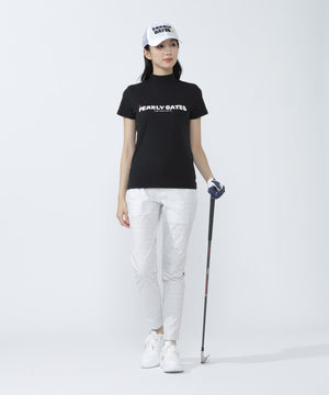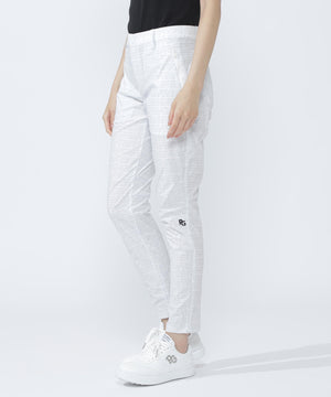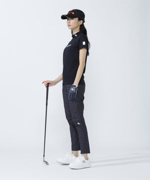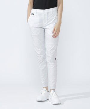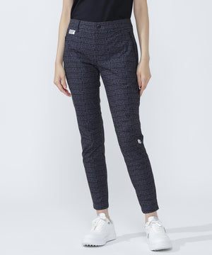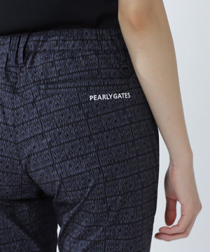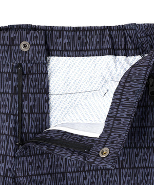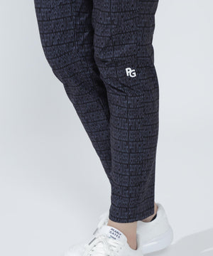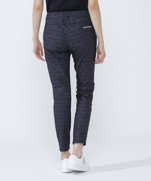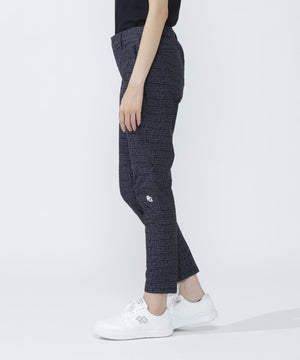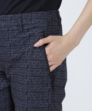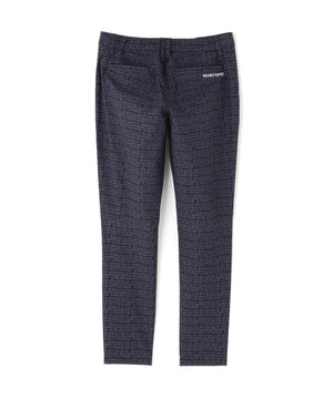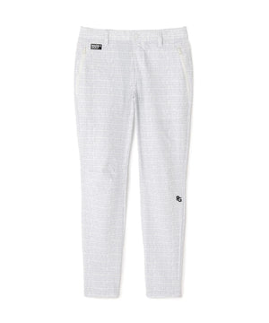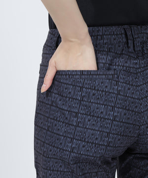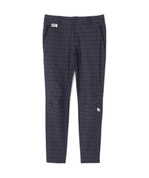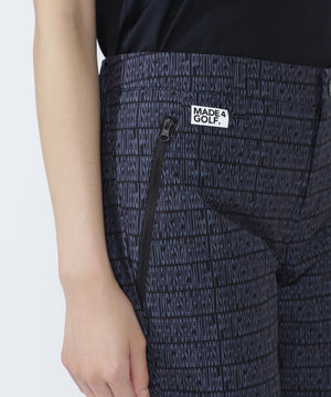 屈伸などのゴルフの動きに対応するように膝部に切替しを入れた、ロゴ組織柄プリントパンツ。