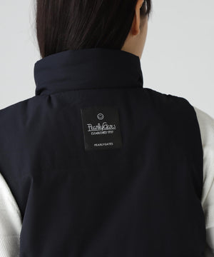 様々なインナーとの組みわせでコーディネイトが楽しめる、異素材の切替しがデザインポイントの中綿ベストアイテムです。