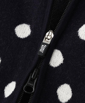 軽やかなリズム感の楽しさと上品さを両立した、14Gダブルジャガードカシミヤ混ランダムドット柄フルジップニットフーディベスト。