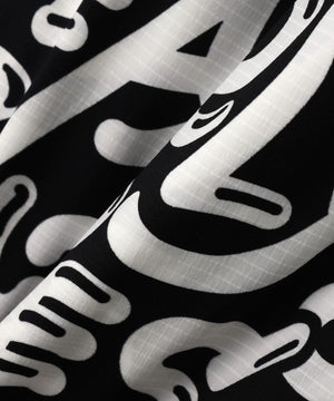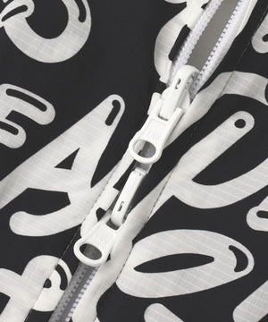 POPなフォントのロゴを大胆にレイアウトした、ぷにぷにロゴ柄 Nyストレッチリップストップ×超KARUISHI軽量中綿リバーシブルスタンドブルゾン。