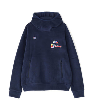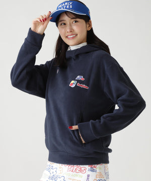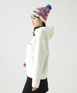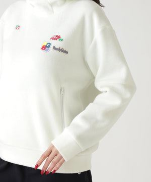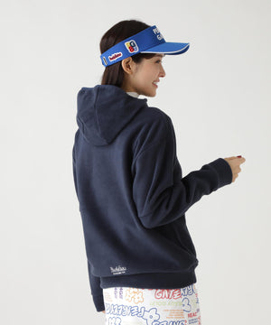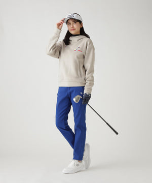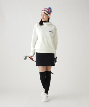 冬ゴルフのホリデイ気分を一気に盛り上げてくれる新しいフォントやワッペン風のロゴをバランスよくレイアウトした、レーヨンブレンドストレッチフリースフーディプルオーバー。