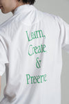 ポロシャツライクなシャツ。しなやかで上品な光沢感ある表面が特徴。フロントはフルジップ式の為開け方次第で様々な着こなしが楽しめます。後ろはメッセージ性を感じるデザインに仕上げました。