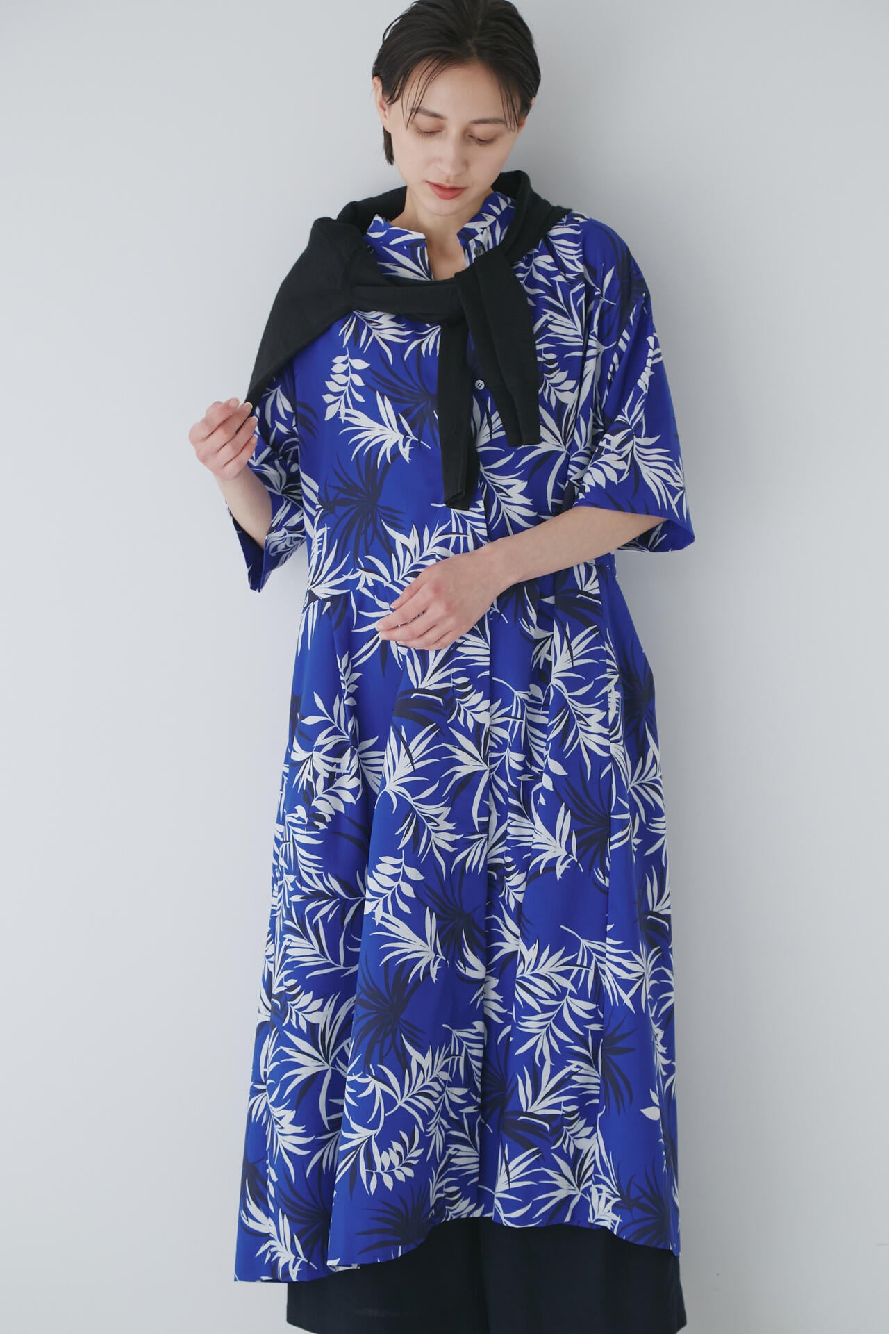 リゾートな雰囲気漂う大振りなリーフ柄をプリントしたバンドカラーのシャツワンピースです。肌離れするゆったりとしたシルエットと、ウエスト切り替え部分のタックディテールがポイントです。