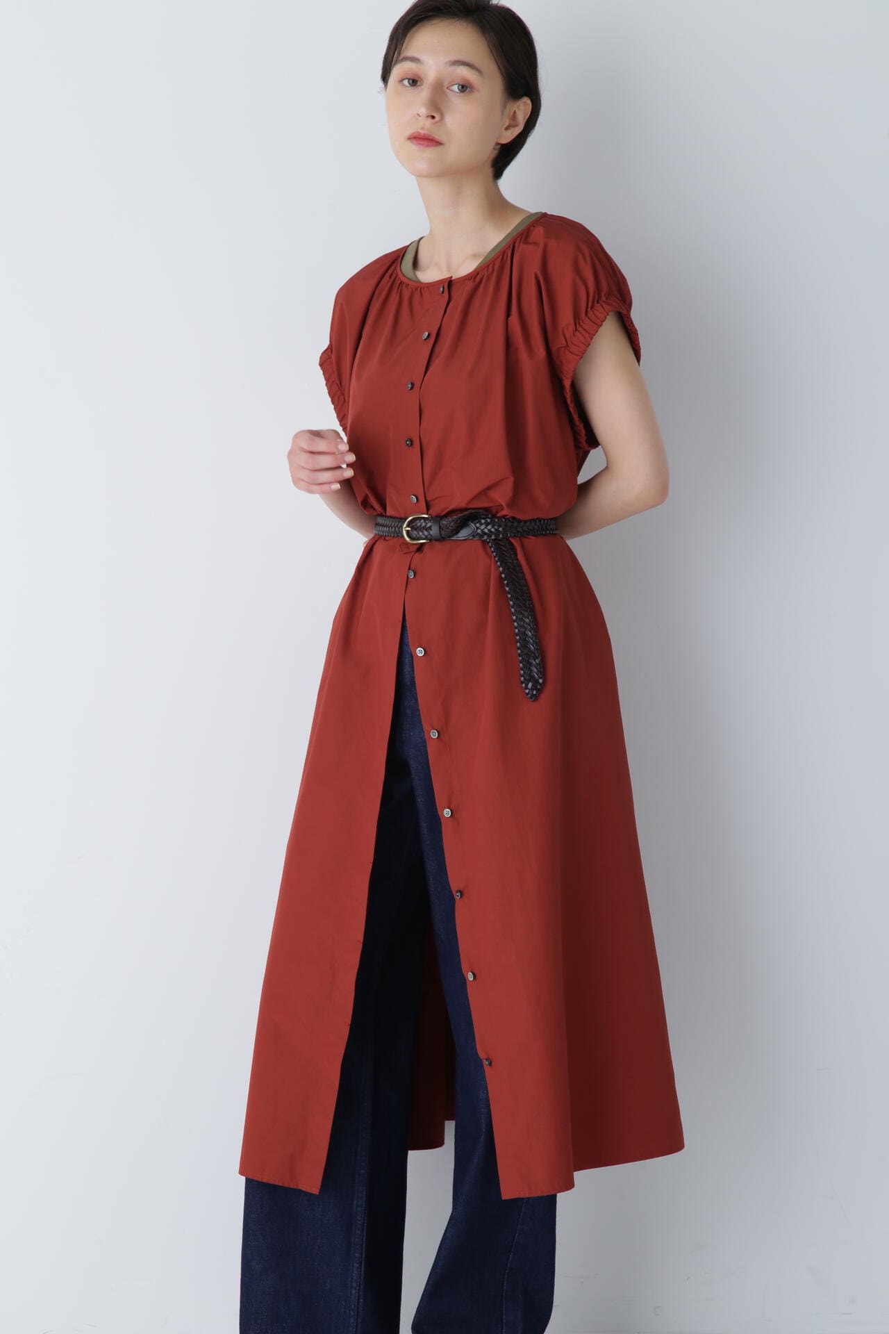 襟ぐりとフレンチスリーブの袖口に施したギャザーディテールがニュアンス感を演出する、肌離れの良いボックスシルエットに仕上げたクルーネックワンピースです。