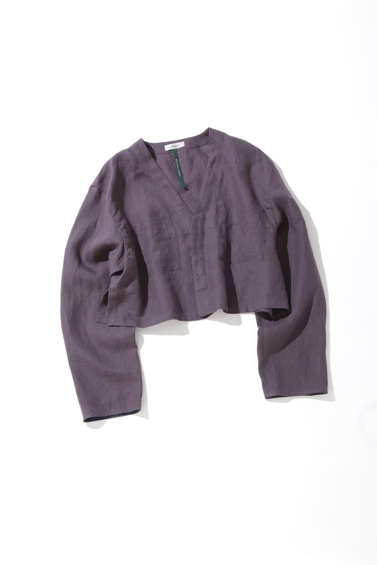 モデルの香菜子さんとコラボでお作りしたカーディガン風の羽織りです。今年らしいショート丈で胸元のポケットがアクセントになっています。長袖の袖口はラフに折り上げるとこなれ感を演出、伸ばすと日焼け対策に便利です。