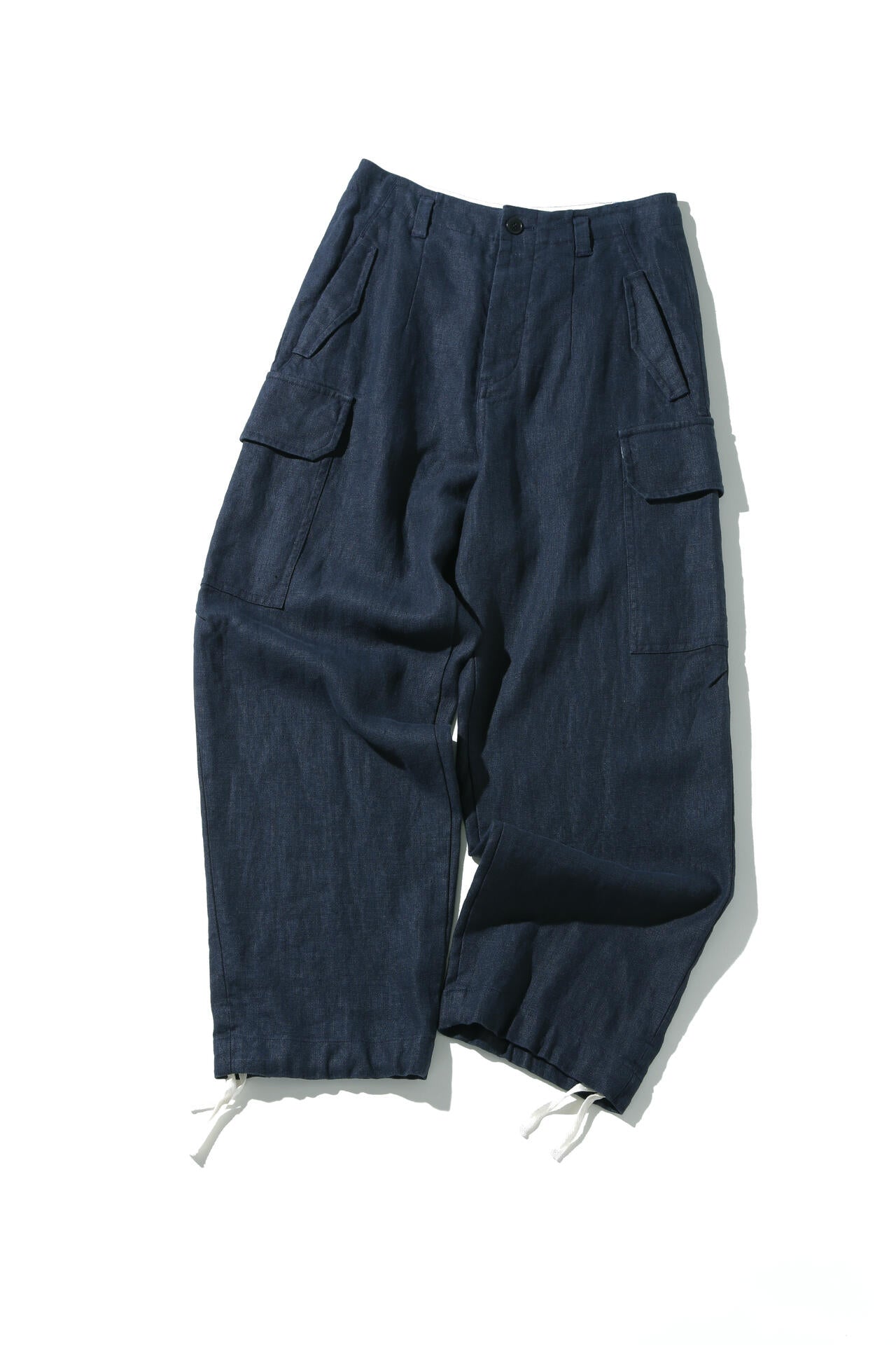 本格的なカーゴパンツのデザインを今の時代に使いやすくディテールをそぎ落としたデザインです。ウエストは内側の紐で調整が可能で、裾は紐で絞るとまた違う表情になりアレンジが楽しめます。白いパンツの透けが心配のないようにポケットの袋布の調節や、素材の良さを活かしたシンプルなデザインなので長く愛用してもらえるように、染め直しが可能な色が染まる糸で縫製するなど仕様にこだわりました。ボタンにも環境にやさしいサトウキビなどから出来た植物由来成分を一部使用した素材のものを使用しています