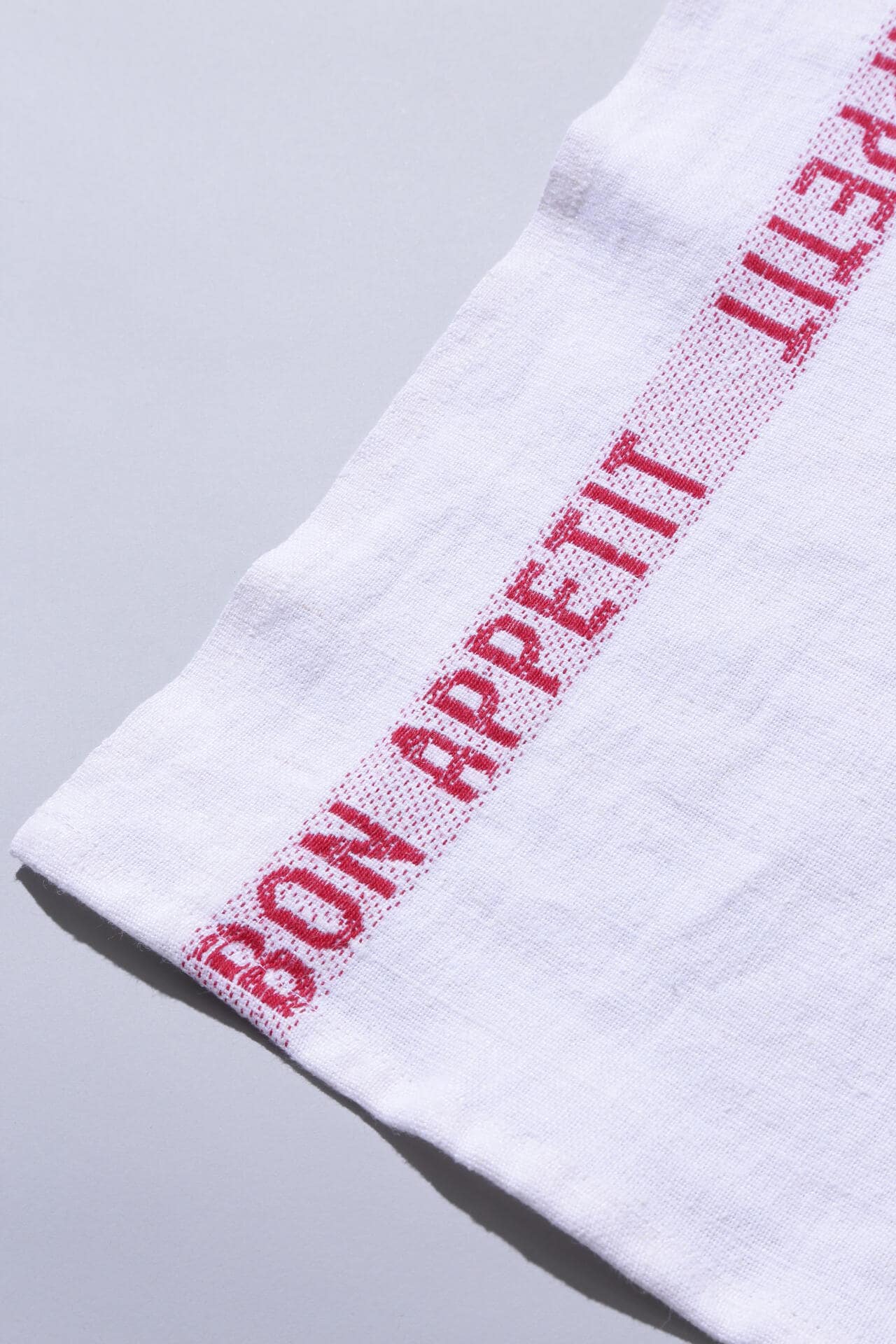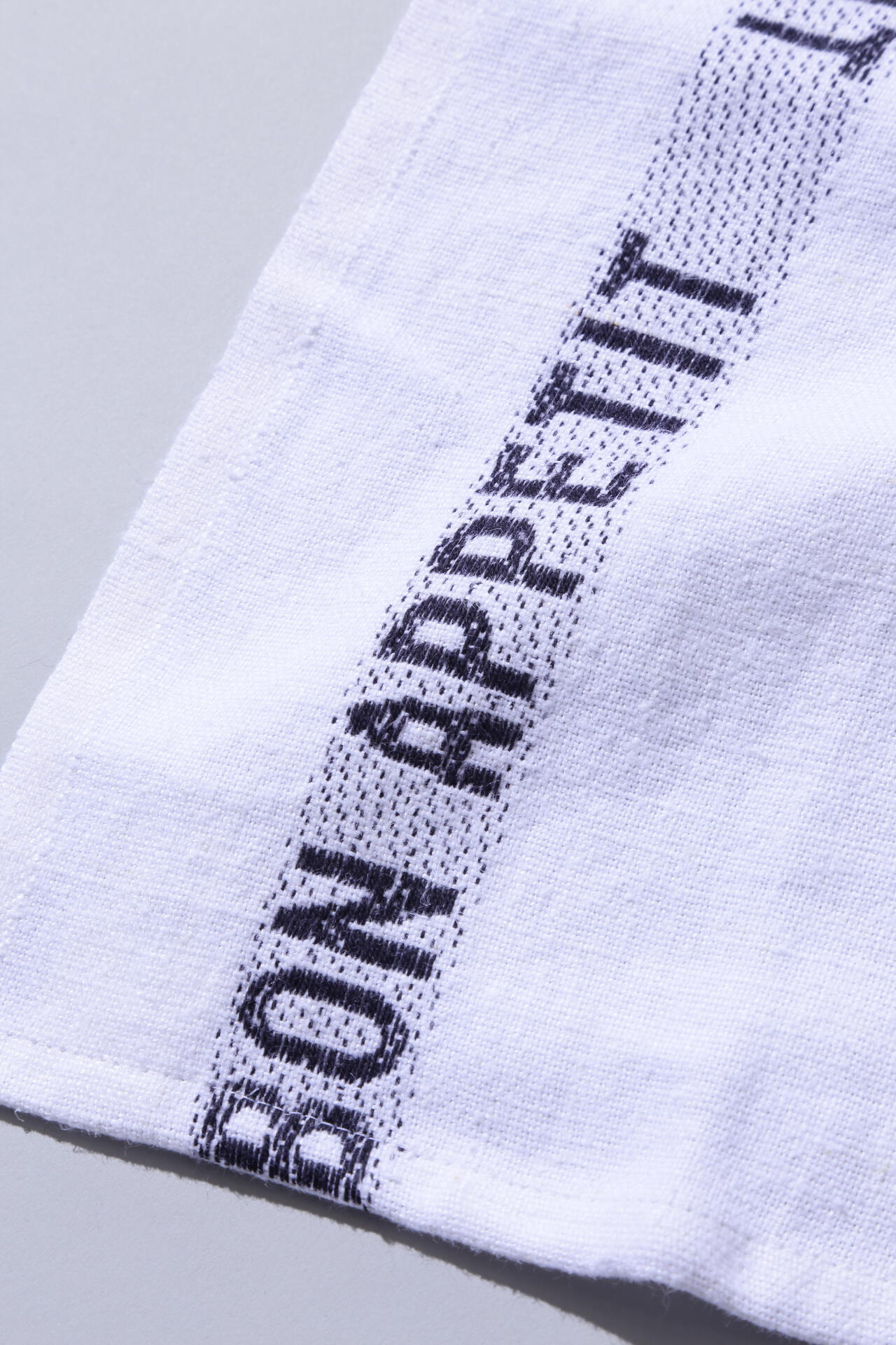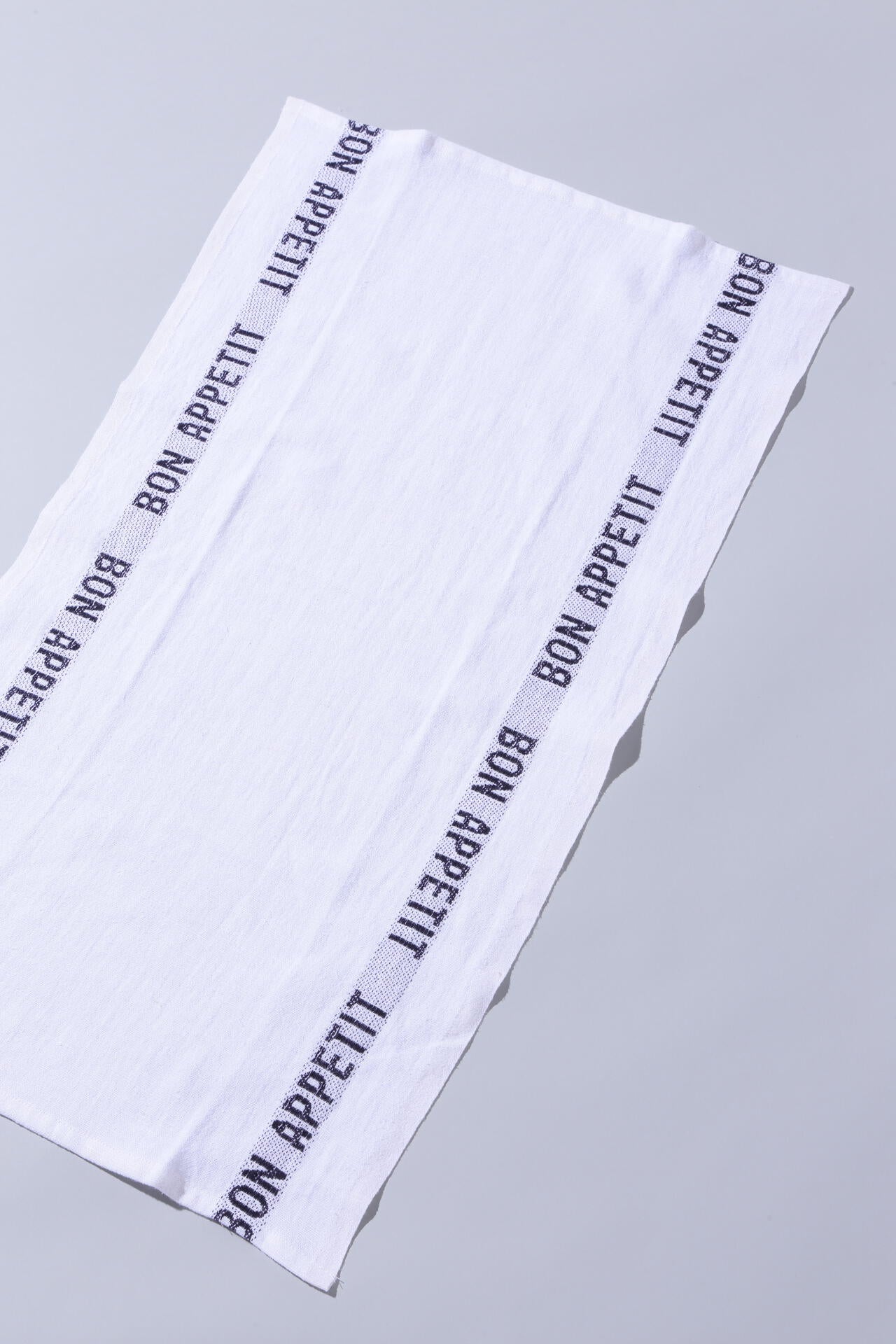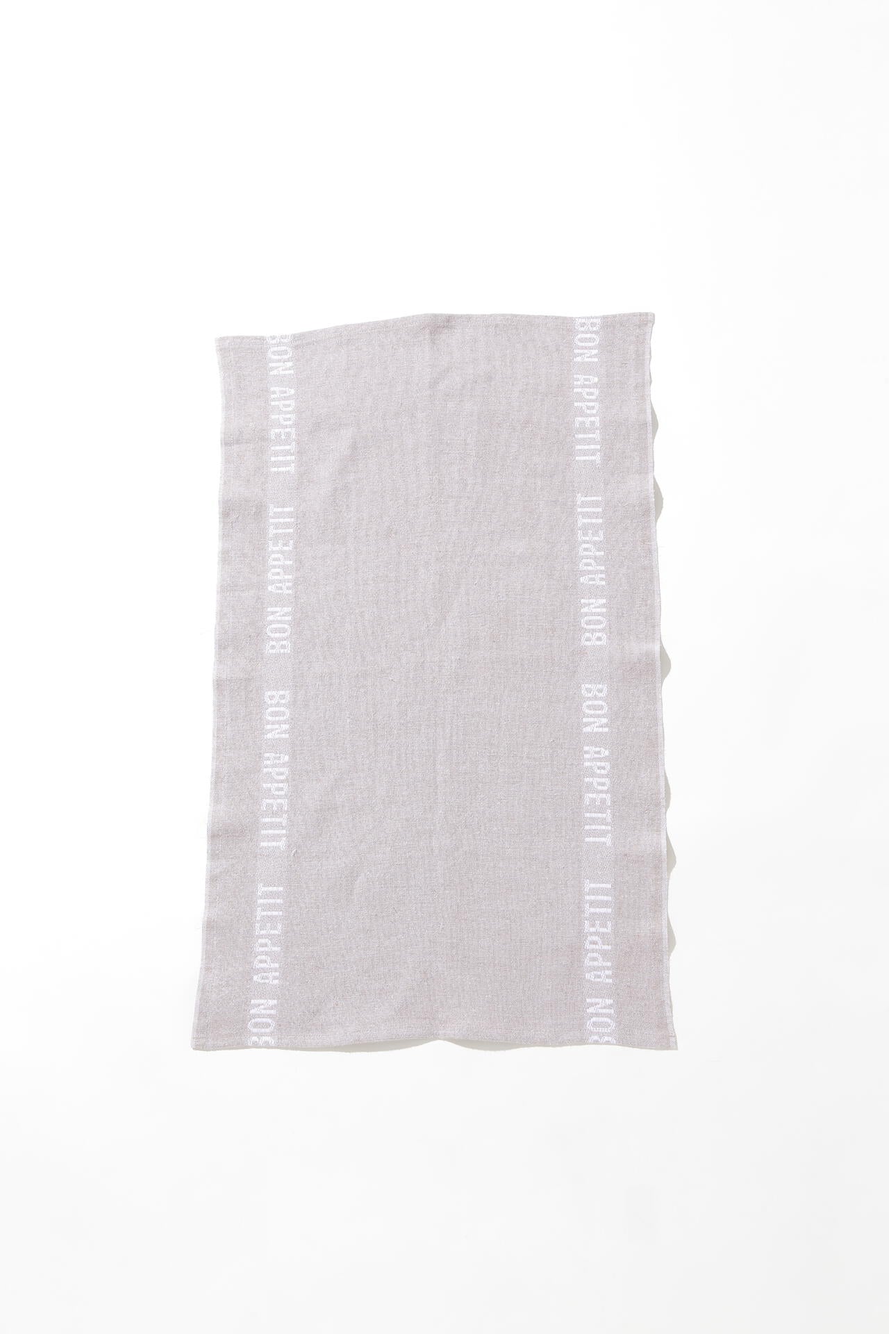 上質なリネン地に織り込まれた、「BON APPETIT(ボナペティ)」がおしゃれなトルション(ティータオル)です。