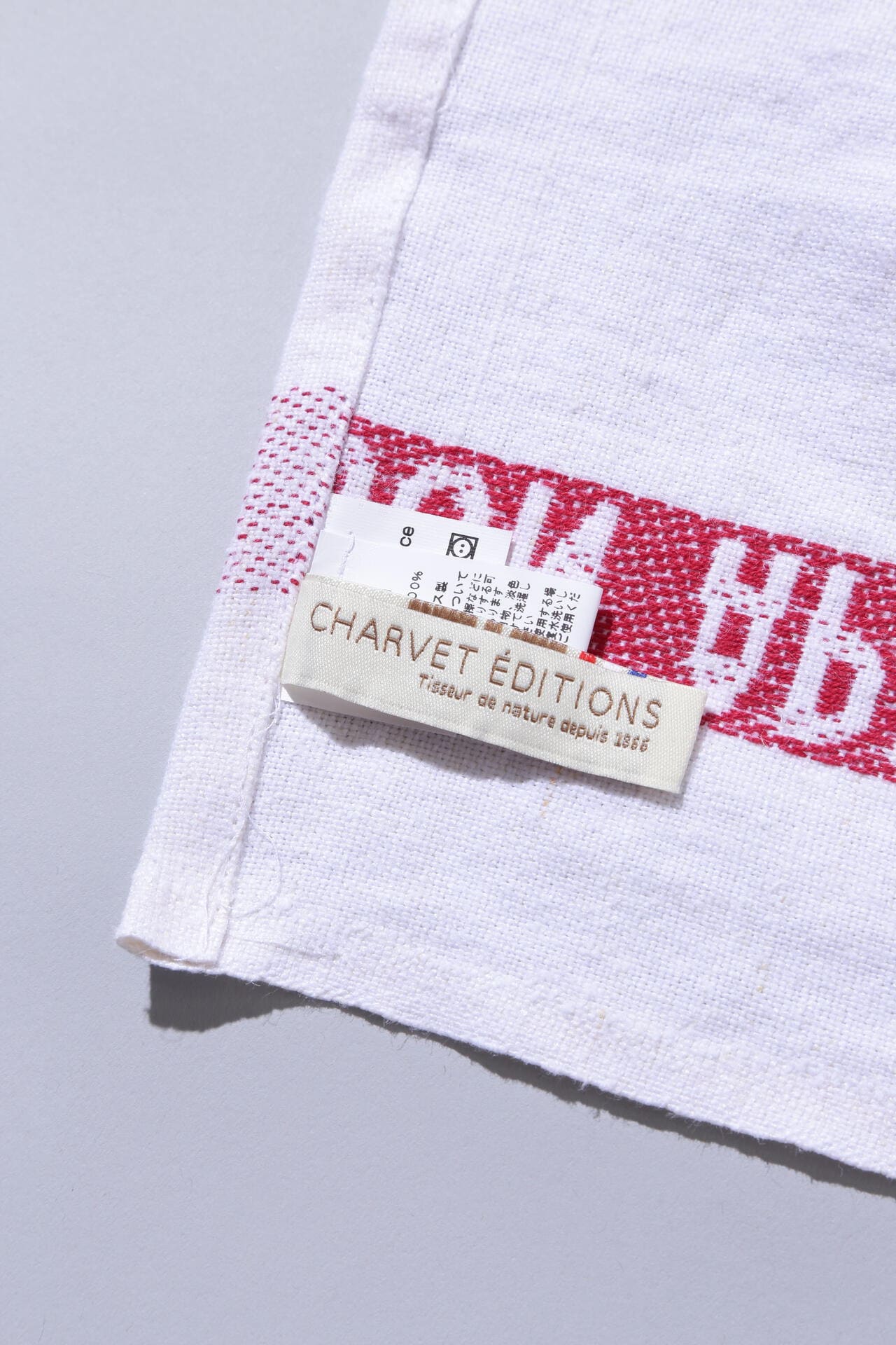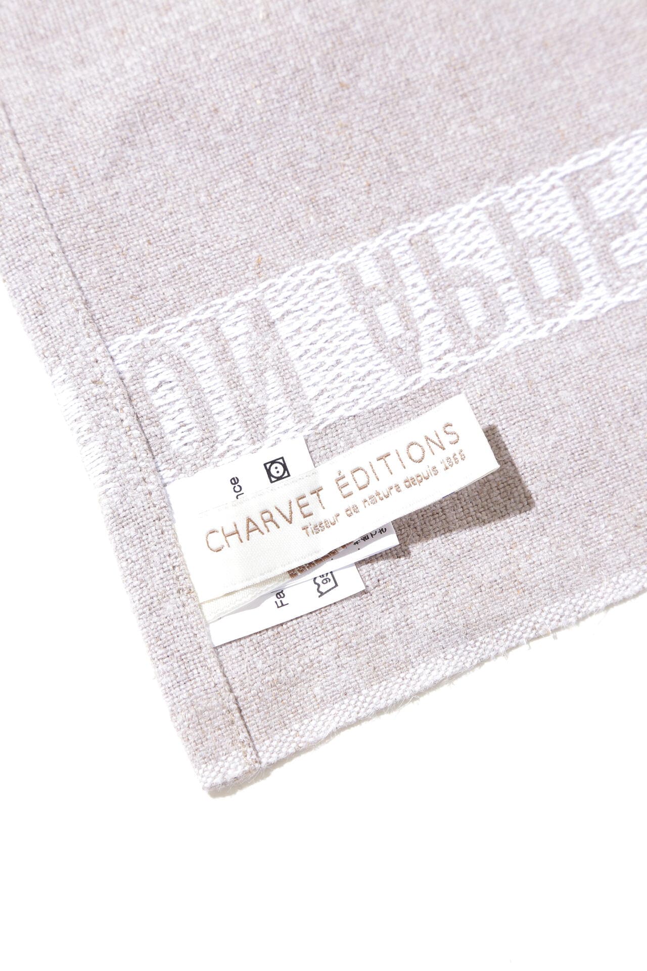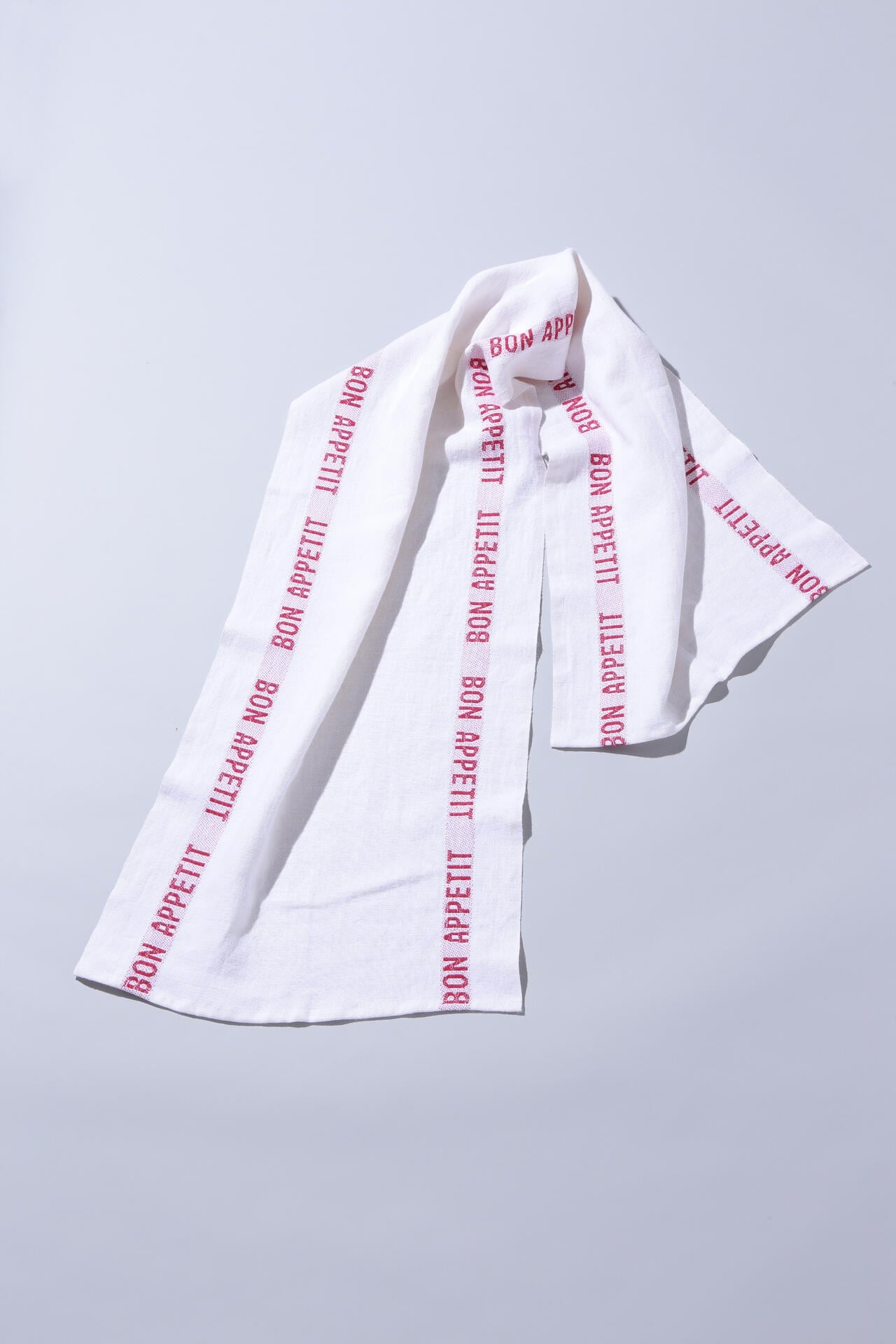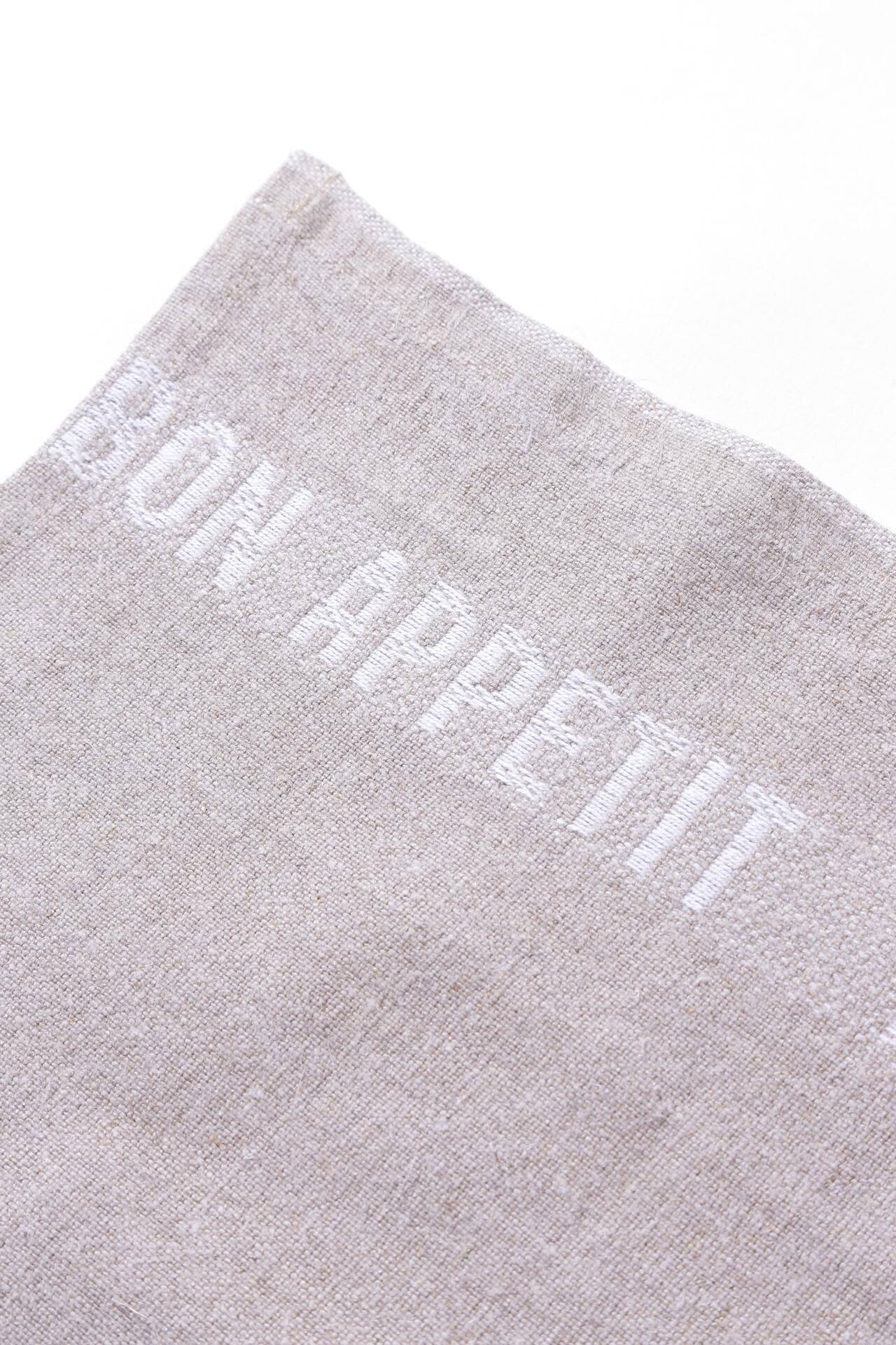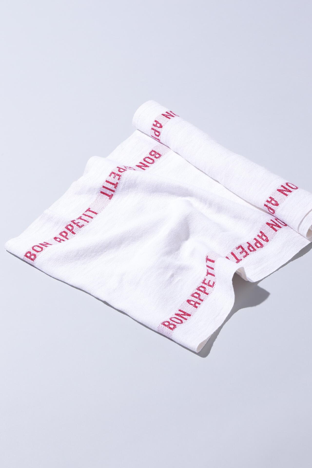 上質なリネン地に織り込まれた、「BON APPETIT(ボナペティ)」がおしゃれなトルション(ティータオル)です。
