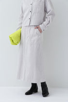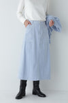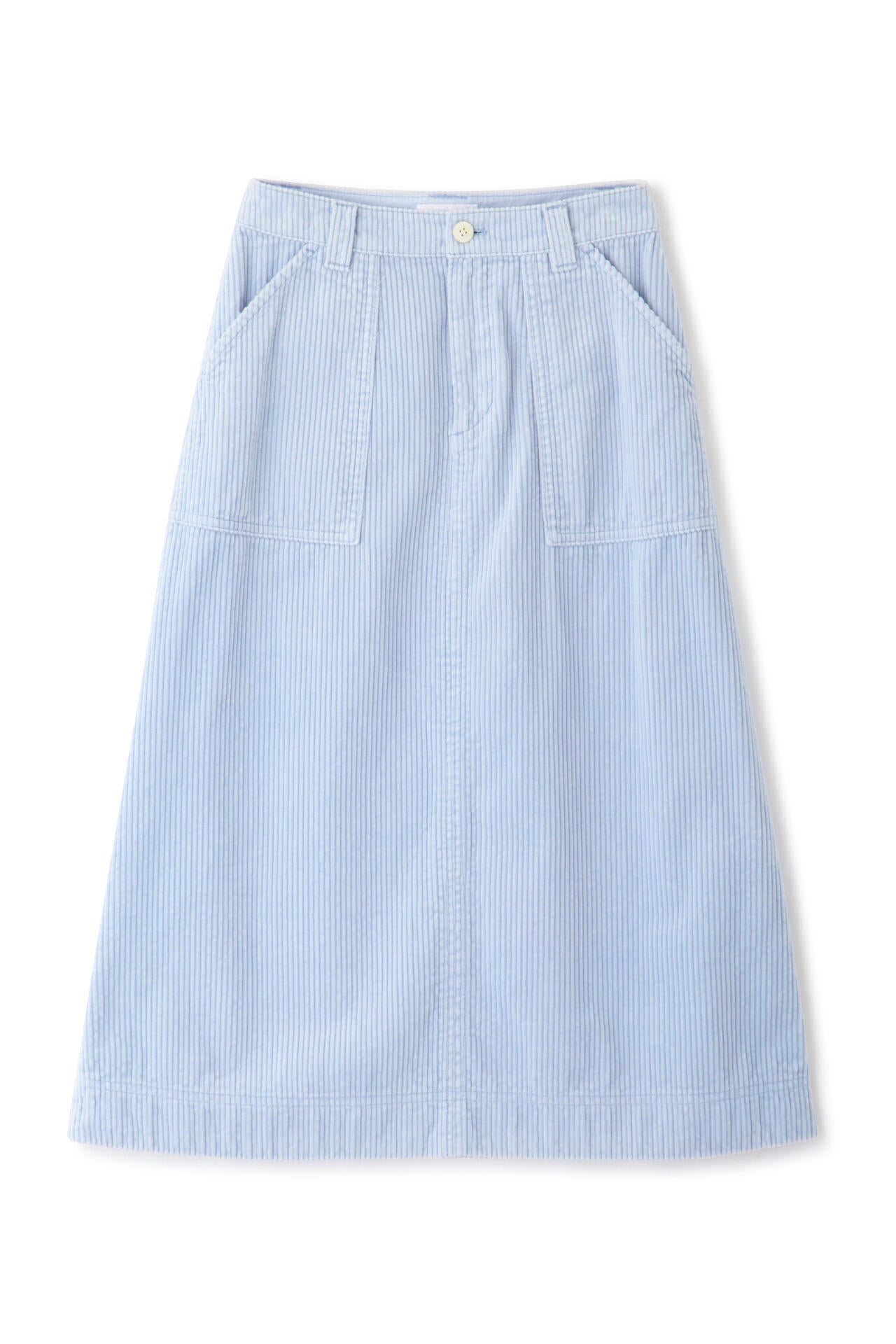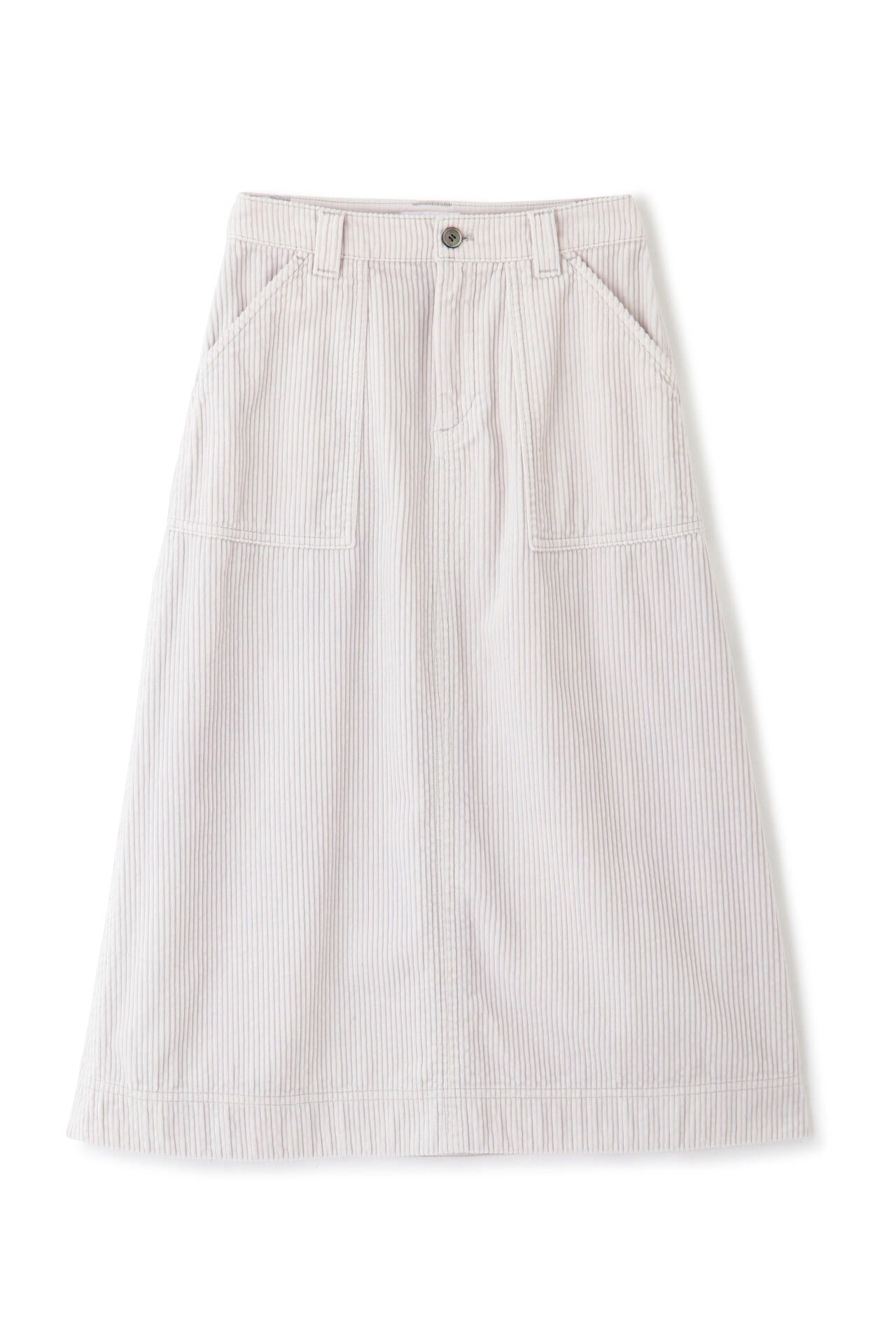 ポケットなどのカジュアルワークディテールが効いたAラインスカートです。後中心のベルトループの飾りボタンと前中心のボタンを貝ボタンにしているのもポイントです。