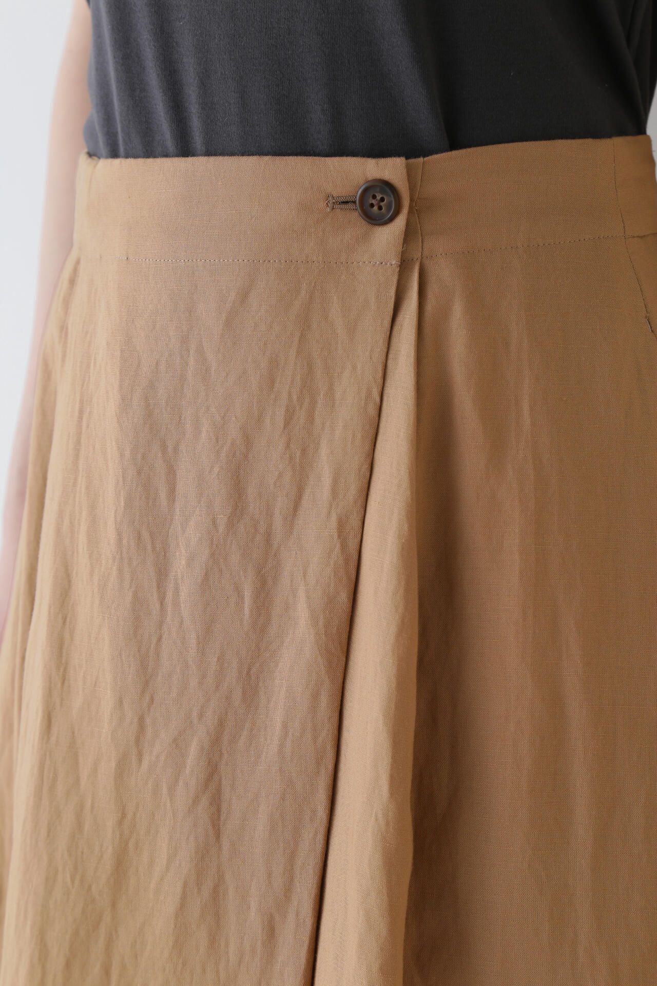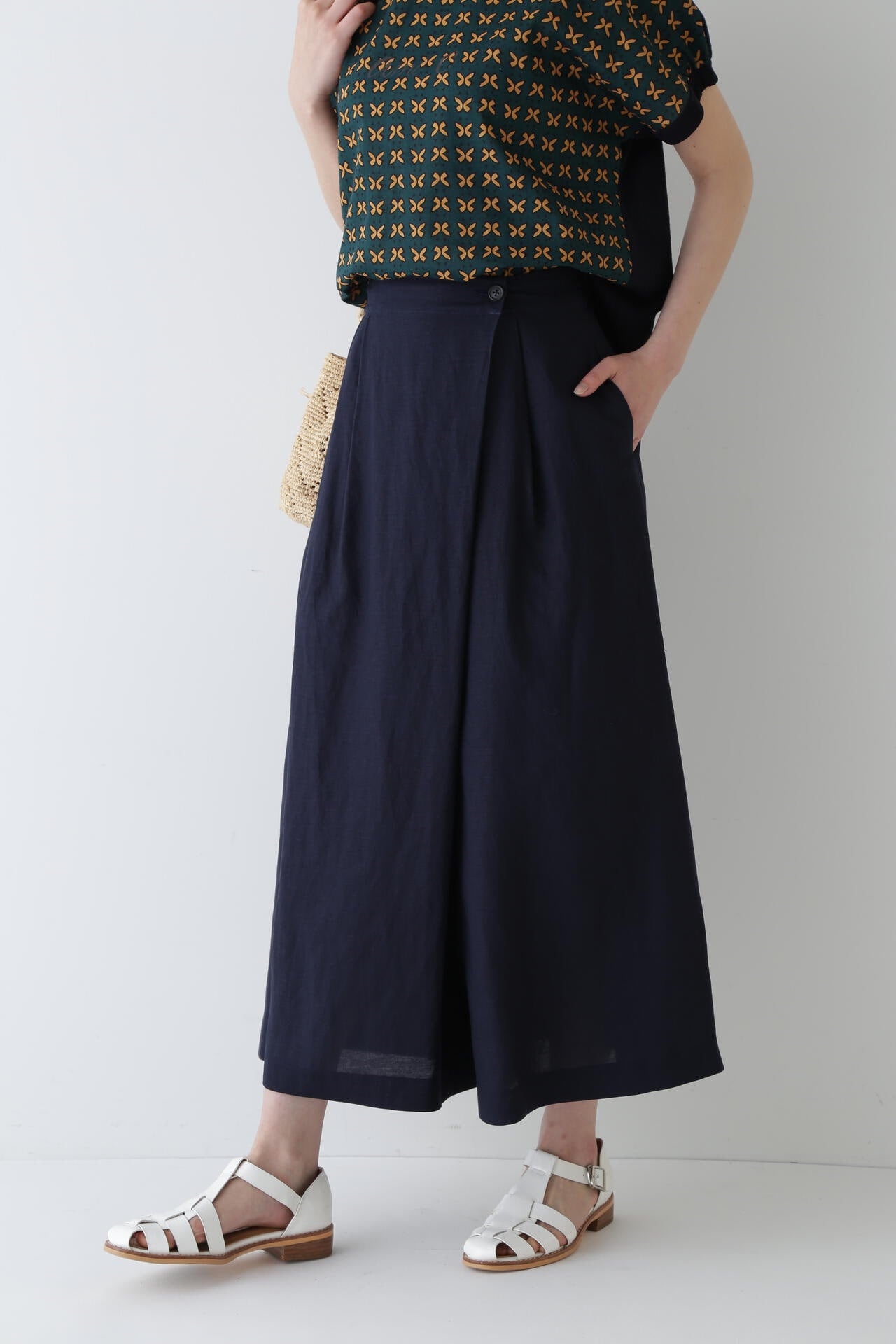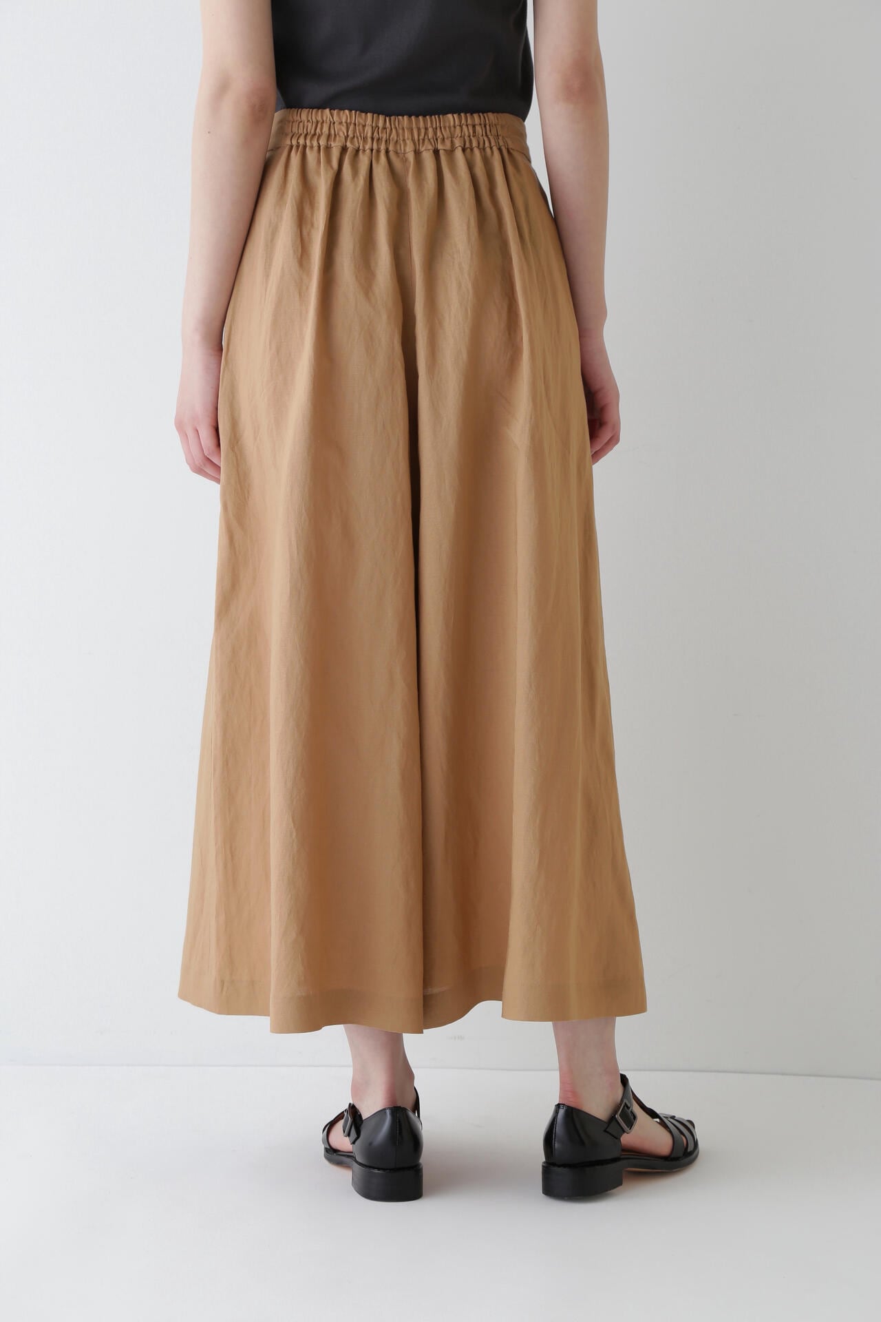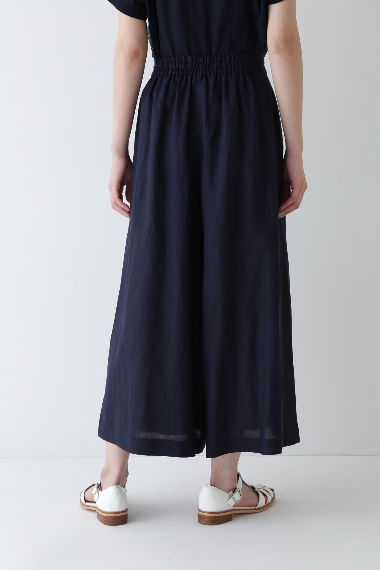 さらっとした履き心地が魅力のスカーチョは、ランダムにとったタックとフロントの深めの打ち合わせを利用したボタンの留めがポイントです。後ろウエストはゴム仕様で、しっかりとギャザー分量をとっているので涼しい履き心地です。
