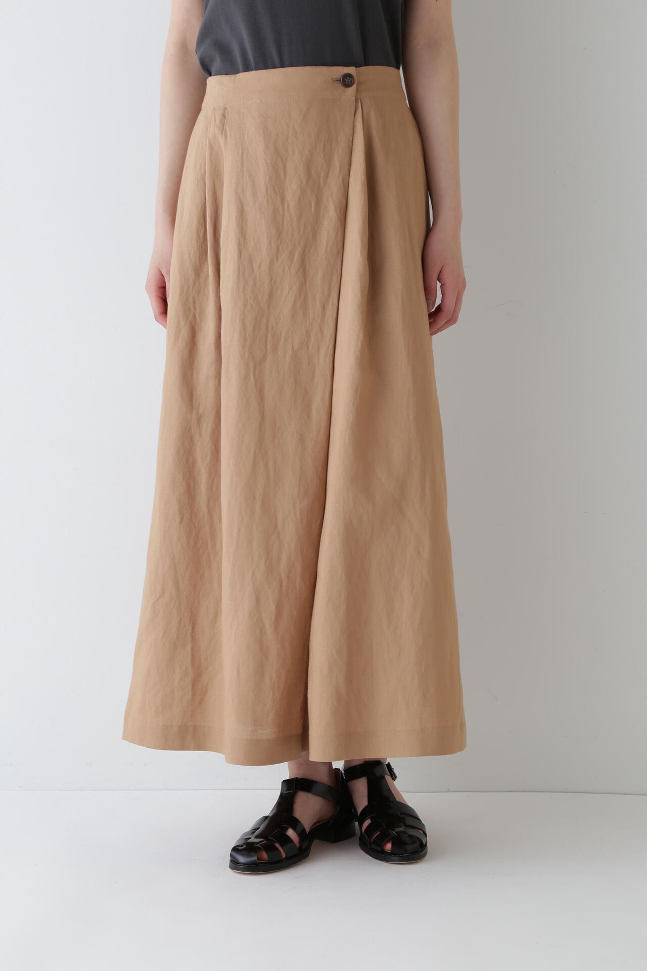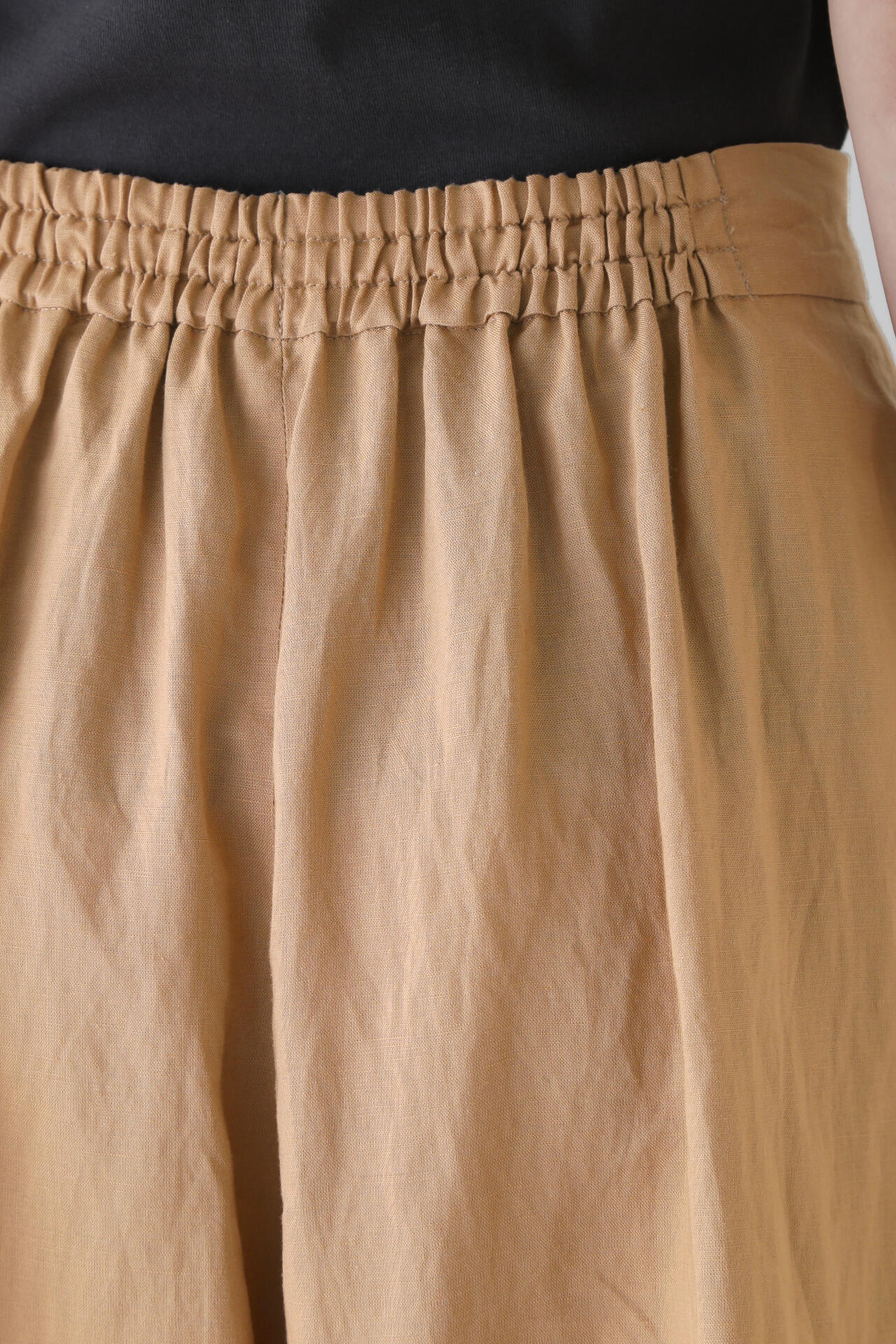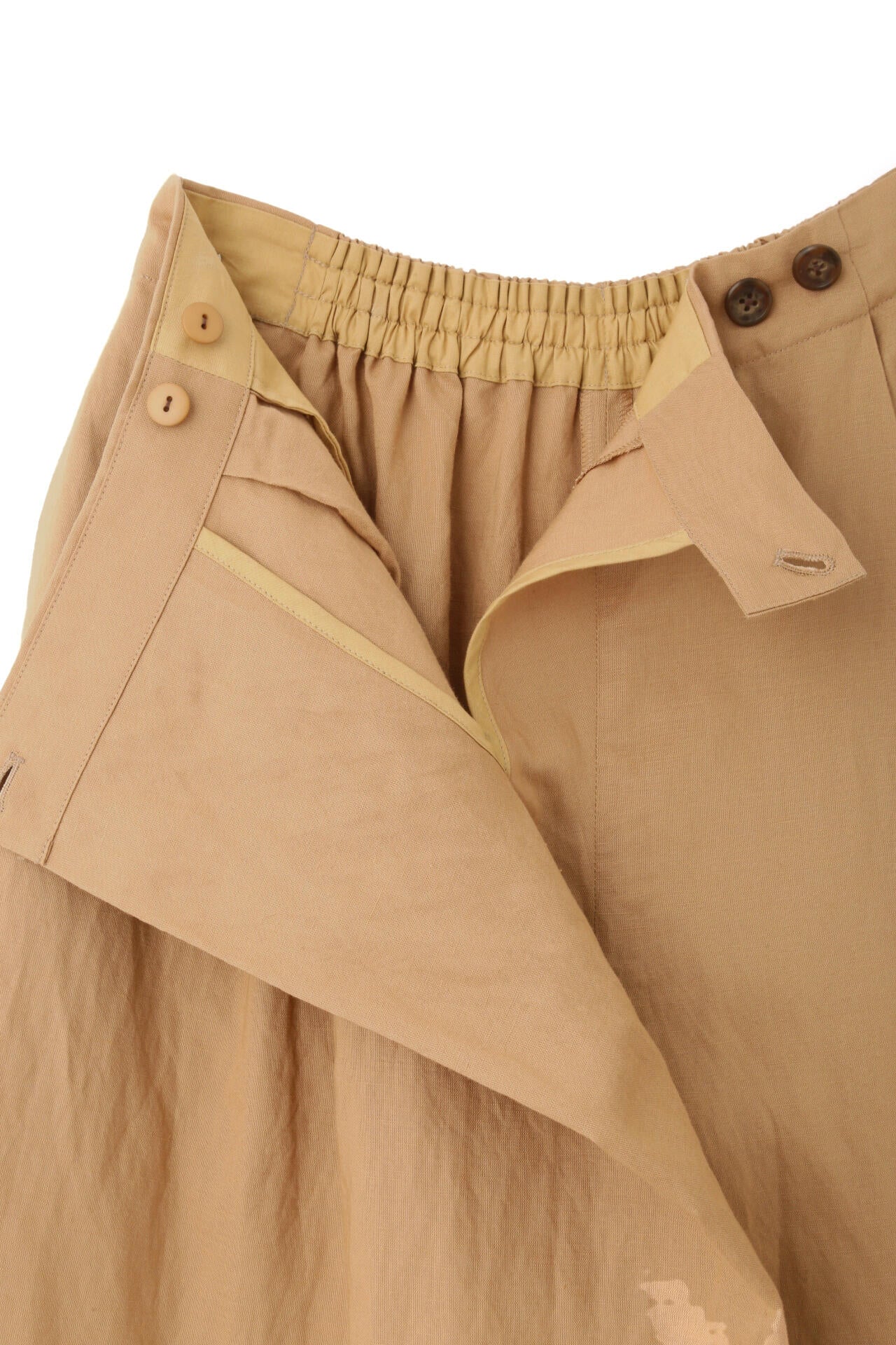 さらっとした履き心地が魅力のスカーチョは、ランダムにとったタックとフロントの深めの打ち合わせを利用したボタンの留めがポイントです。後ろウエストはゴム仕様で、しっかりとギャザー分量をとっているので涼しい履き心地です。