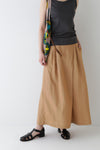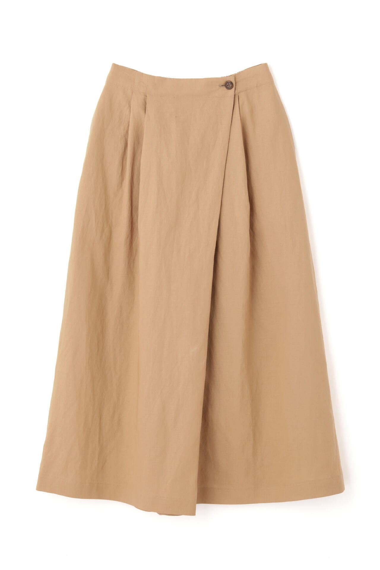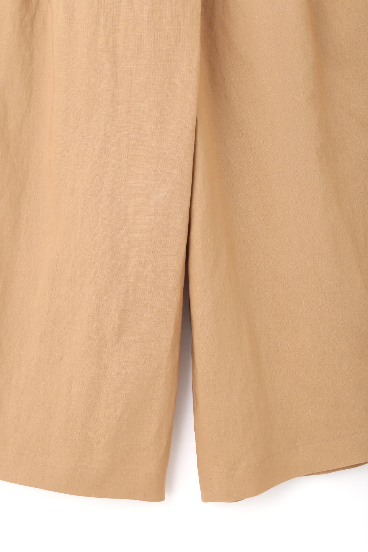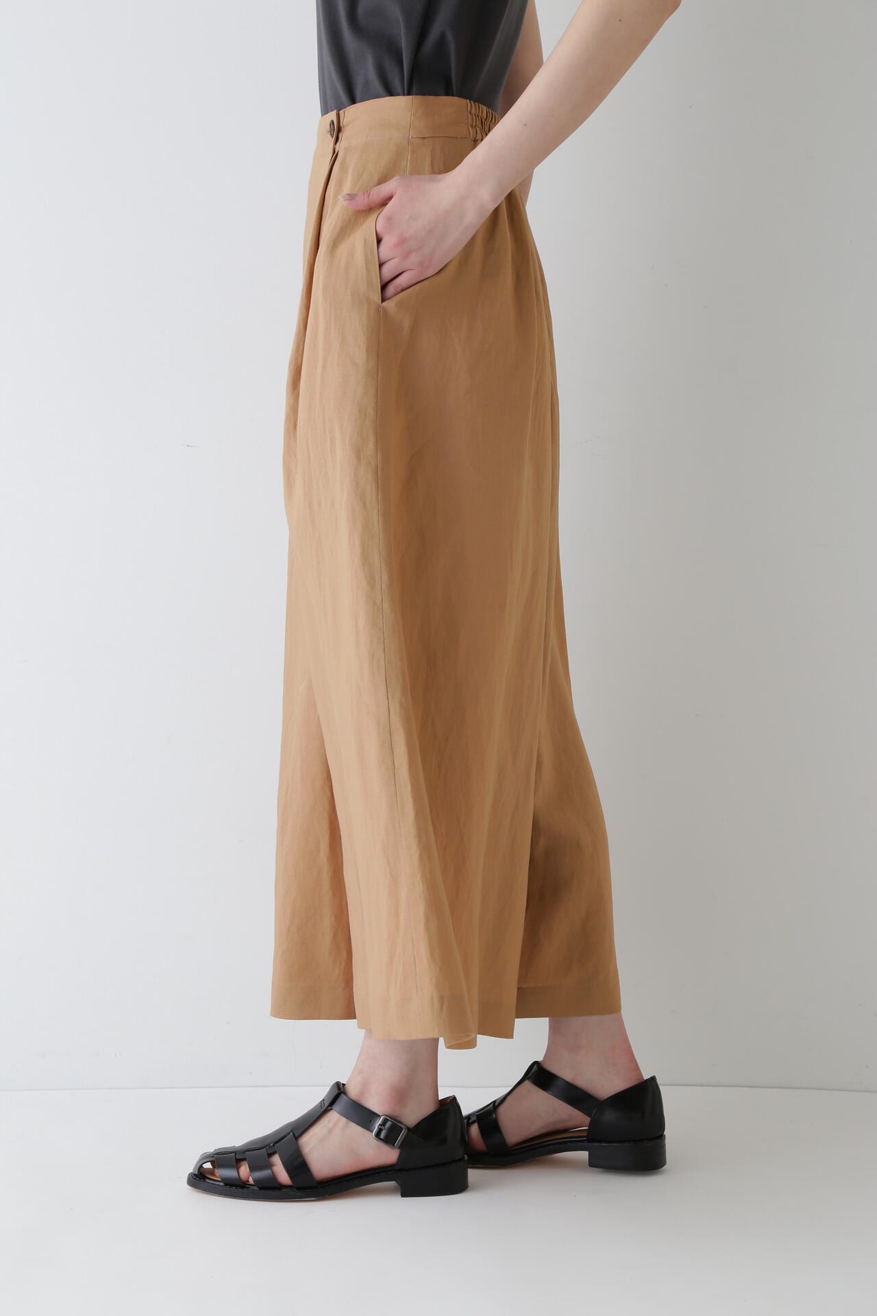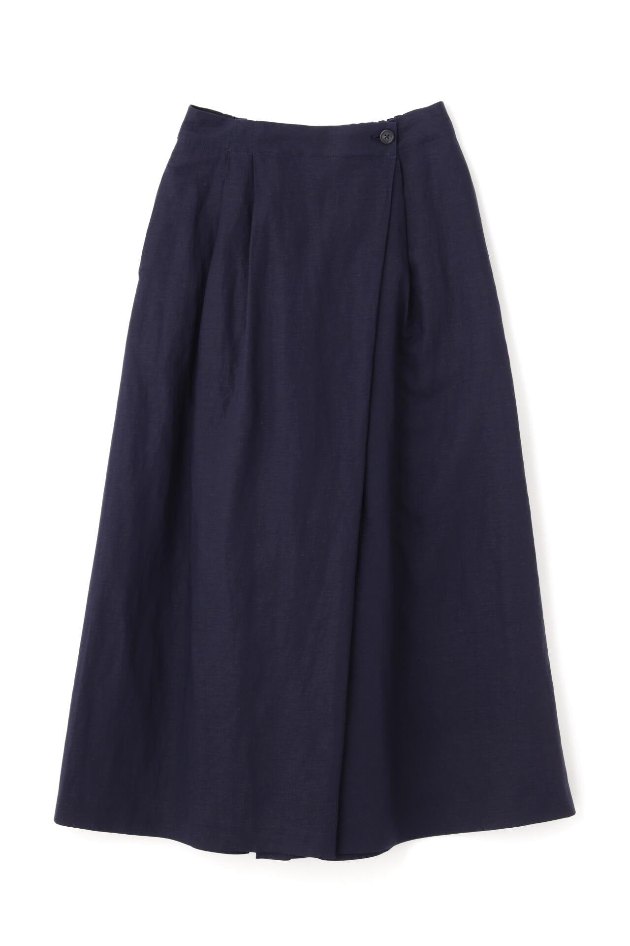 さらっとした履き心地が魅力のスカーチョは、ランダムにとったタックとフロントの深めの打ち合わせを利用したボタンの留めがポイントです。後ろウエストはゴム仕様で、しっかりとギャザー分量をとっているので涼しい履き心地です。