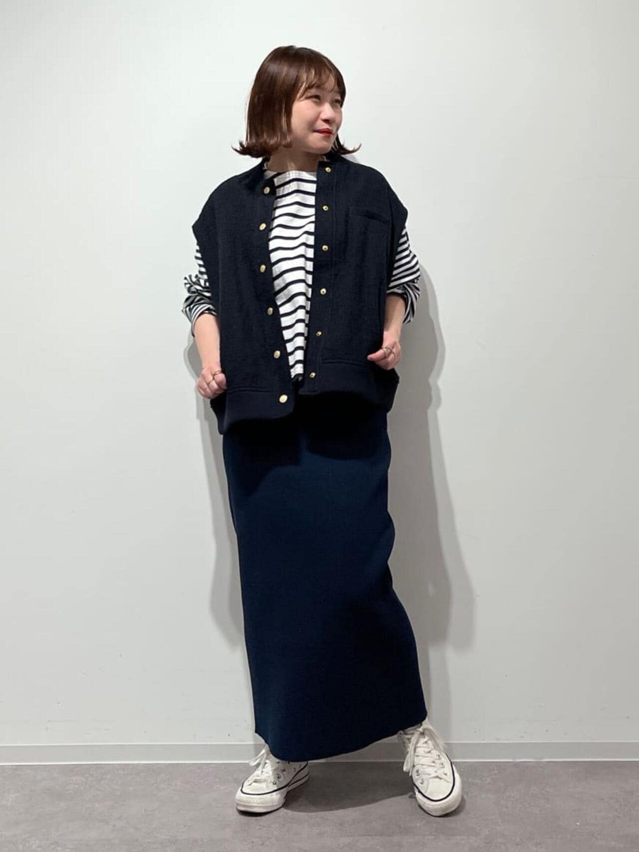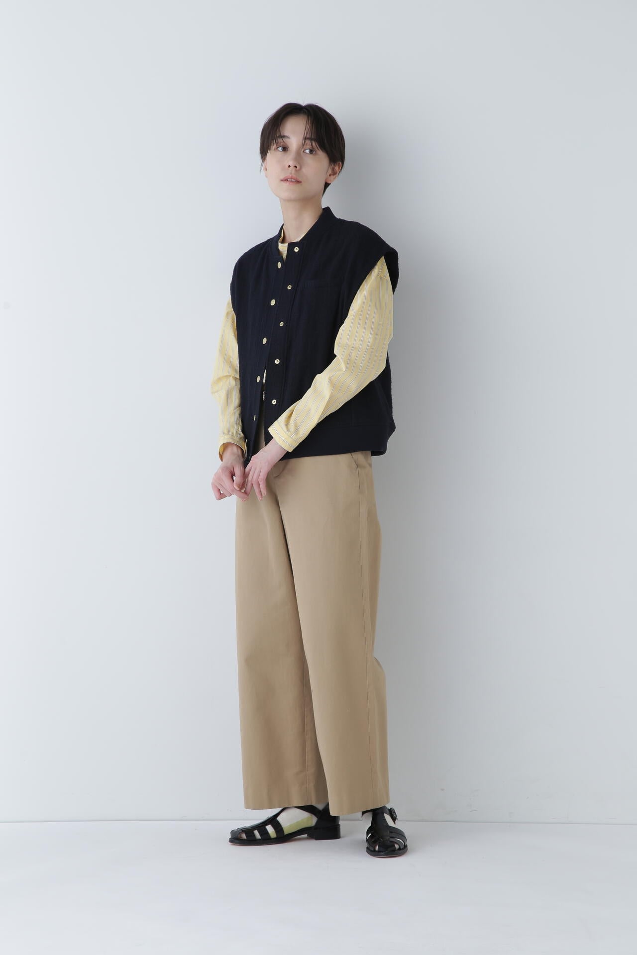 あえてきれい目なシャツブラウスを合わせたMIXテイストなスタイルや、ロゴTシャツと合わせてカジュアルダウンした着こなしがおすすめです。すっきりとした丈感なので、ワイドパンツやボリュームスカートとも好相性なジレです。