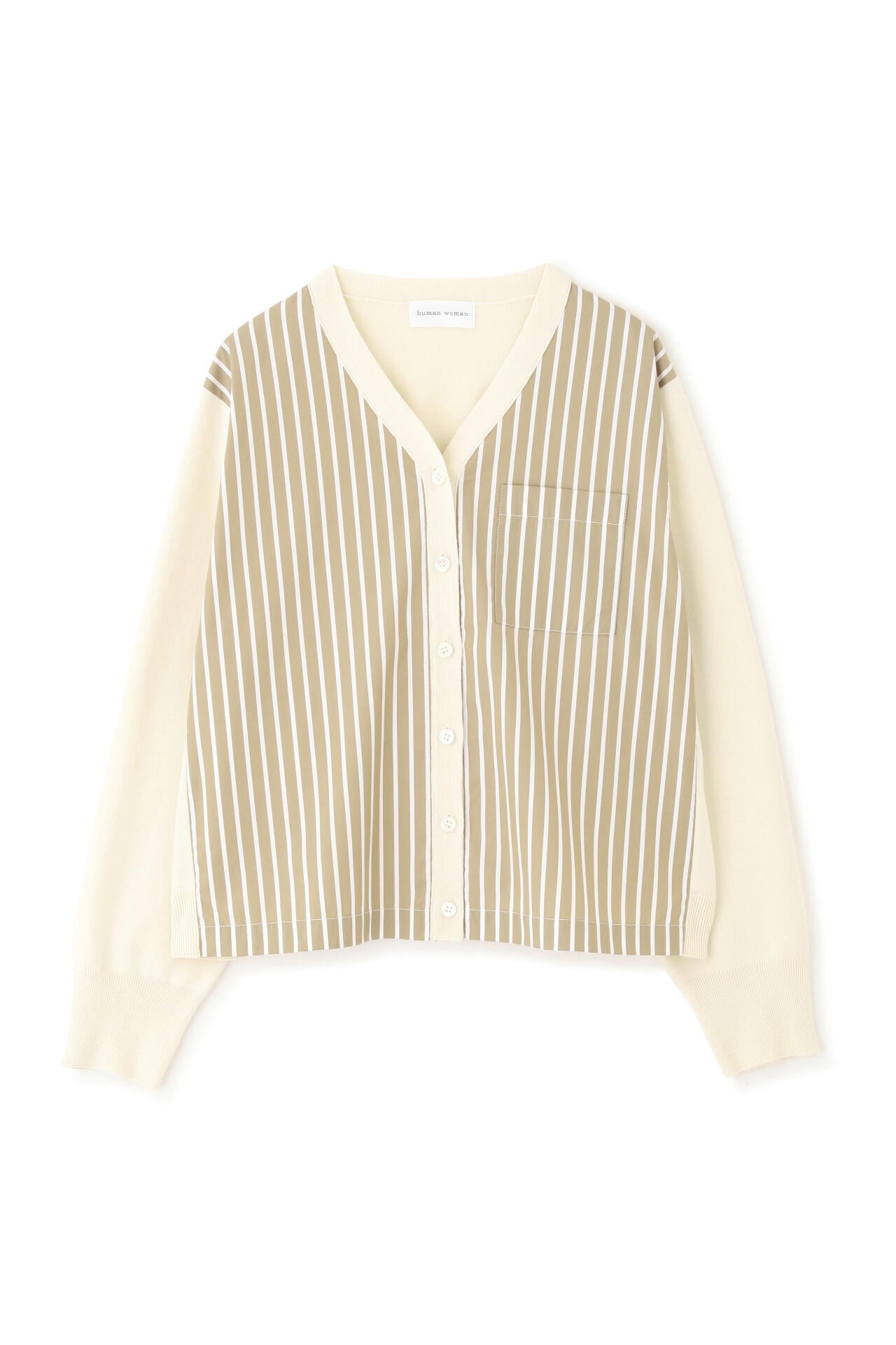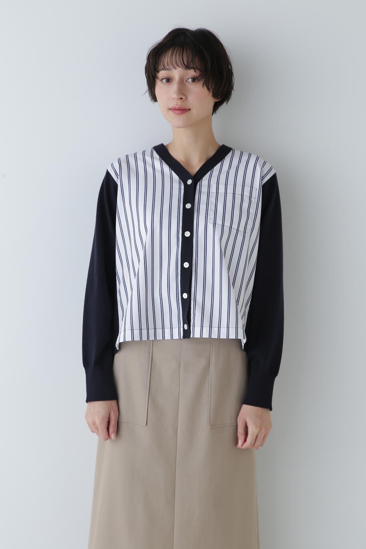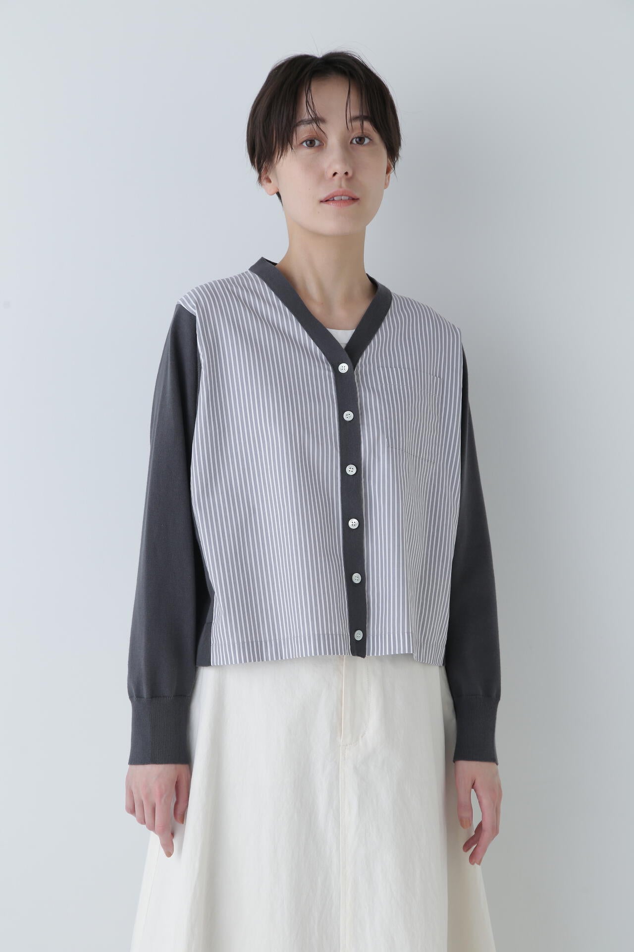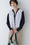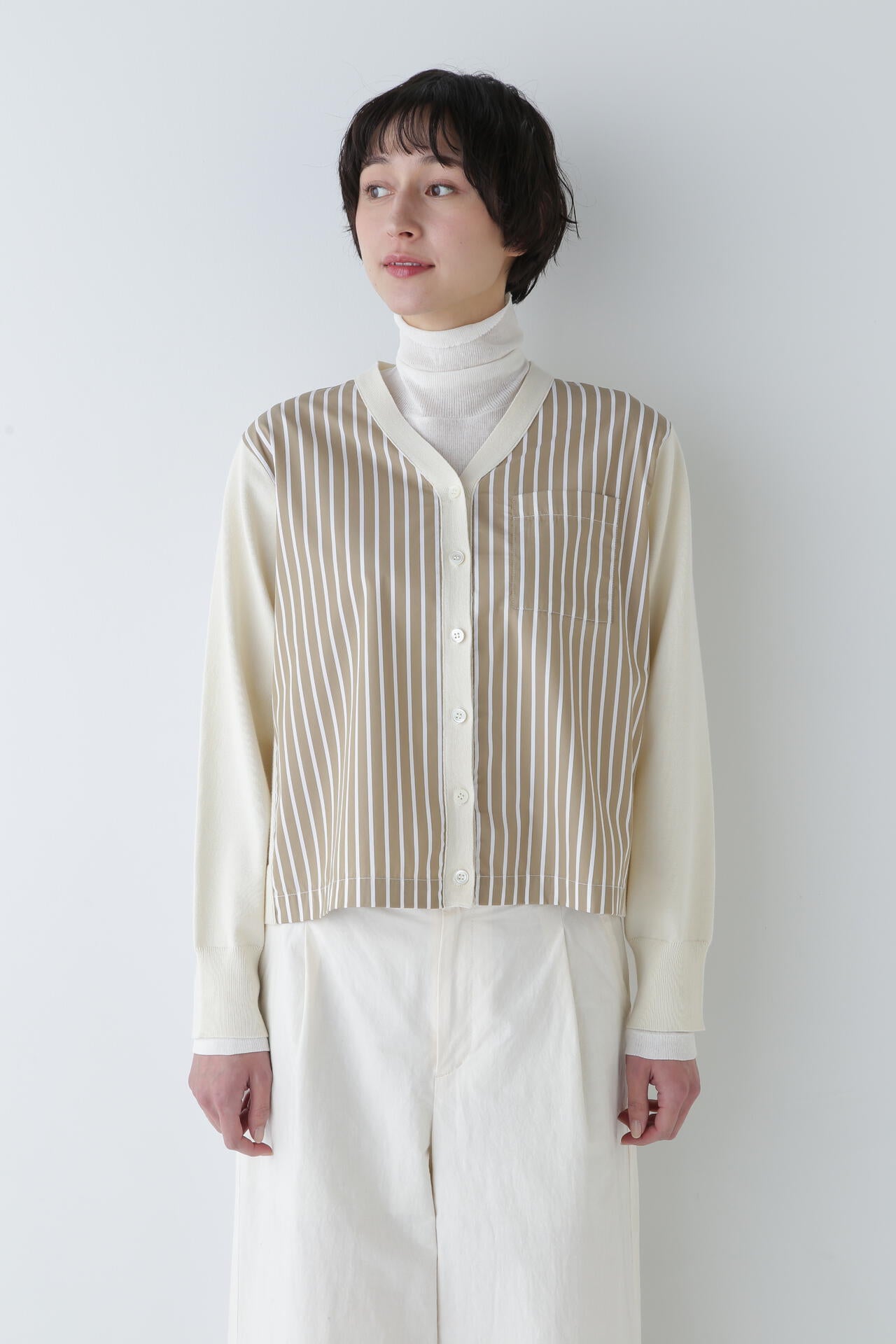 前身頃をストライプ柄の布帛に切り替えたVネックカーディガンです。3色それぞれ異なったストライプ柄を使用しました。