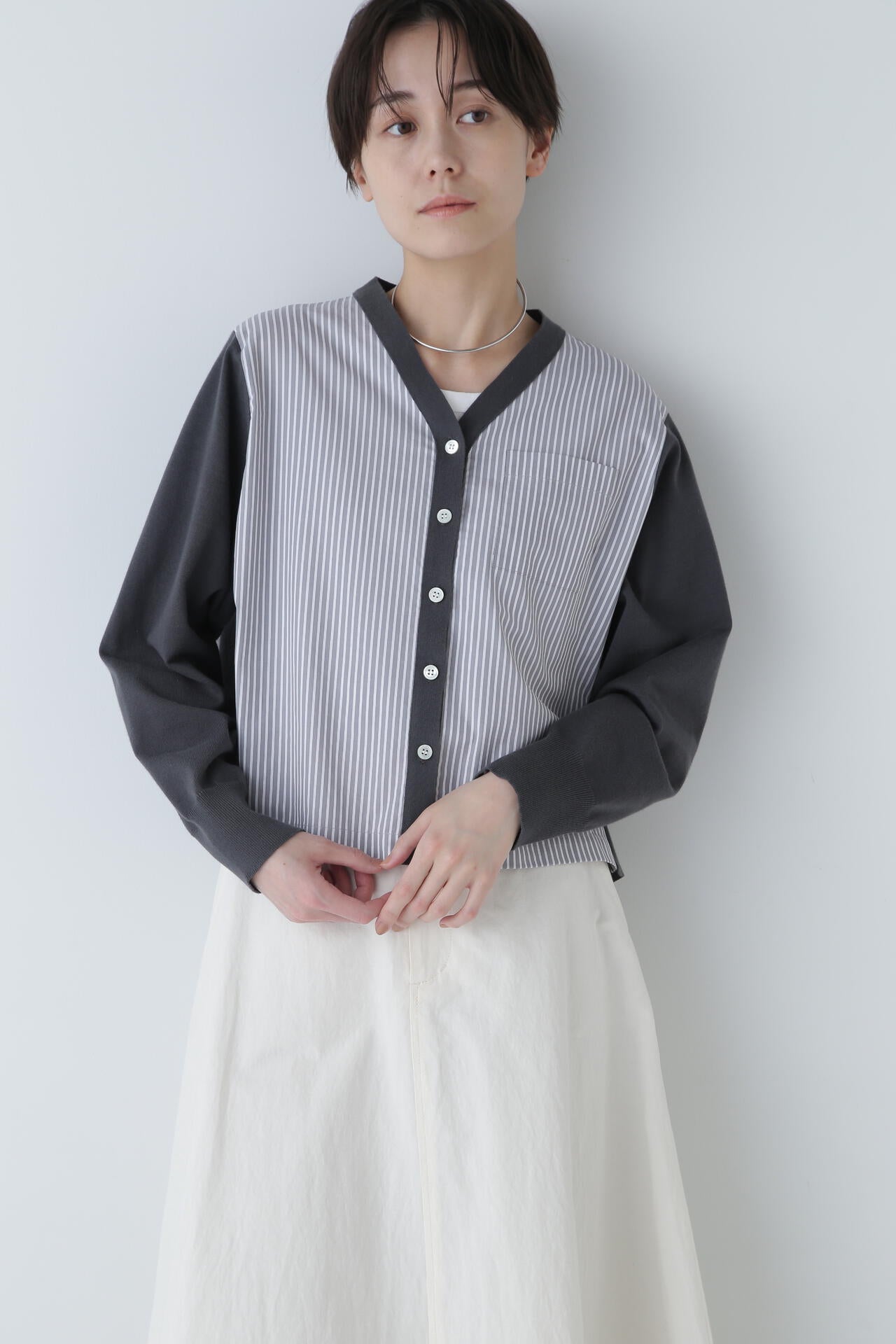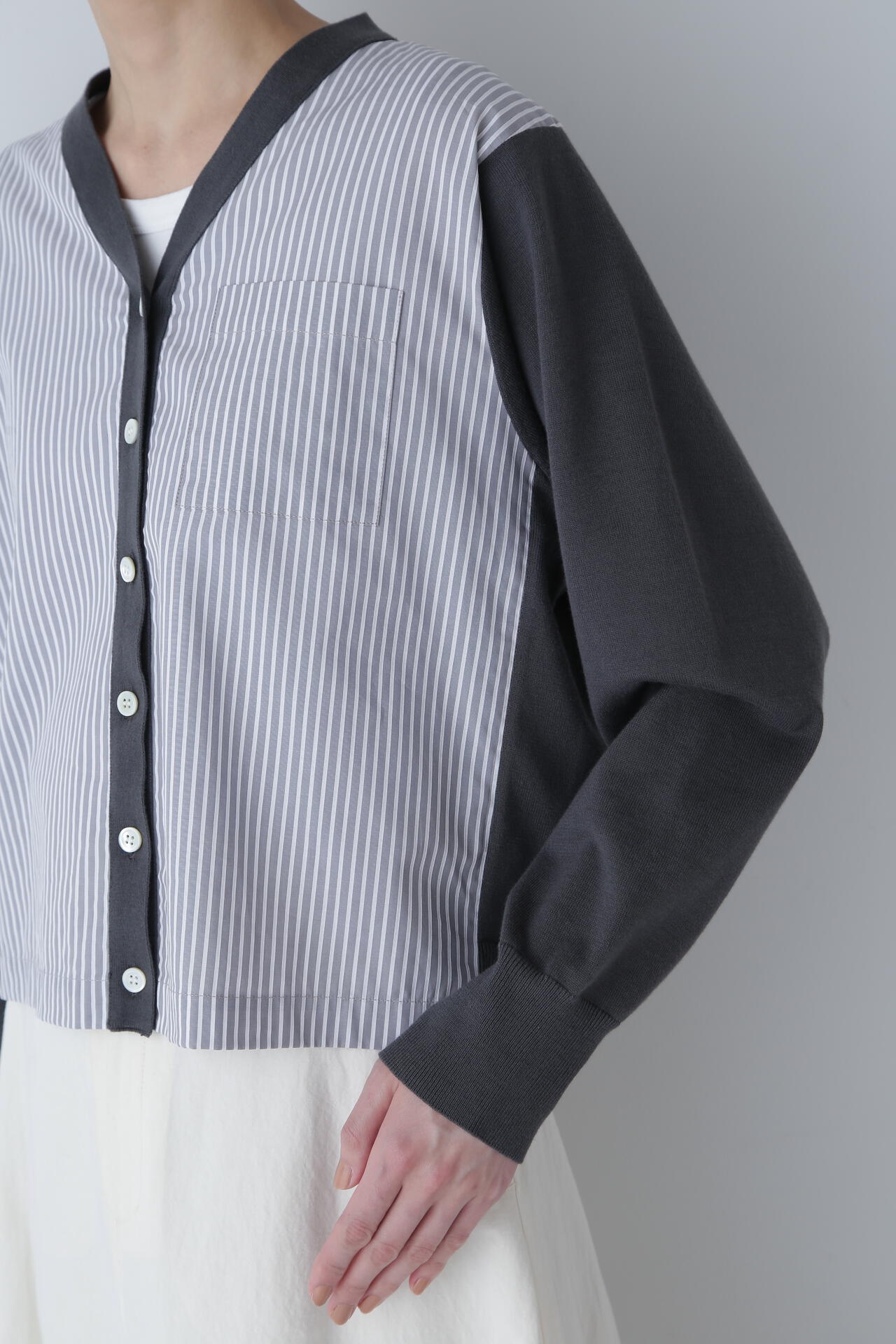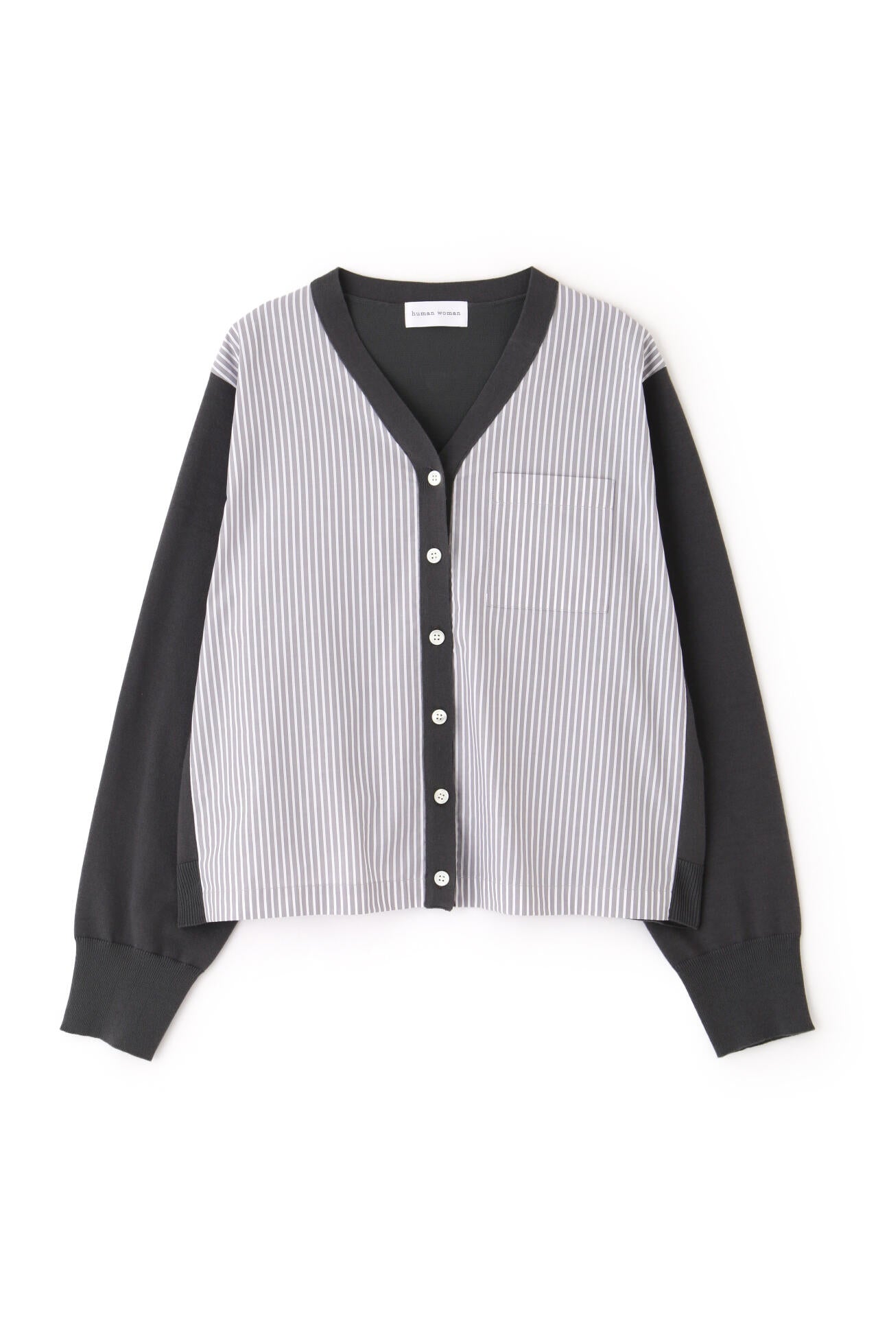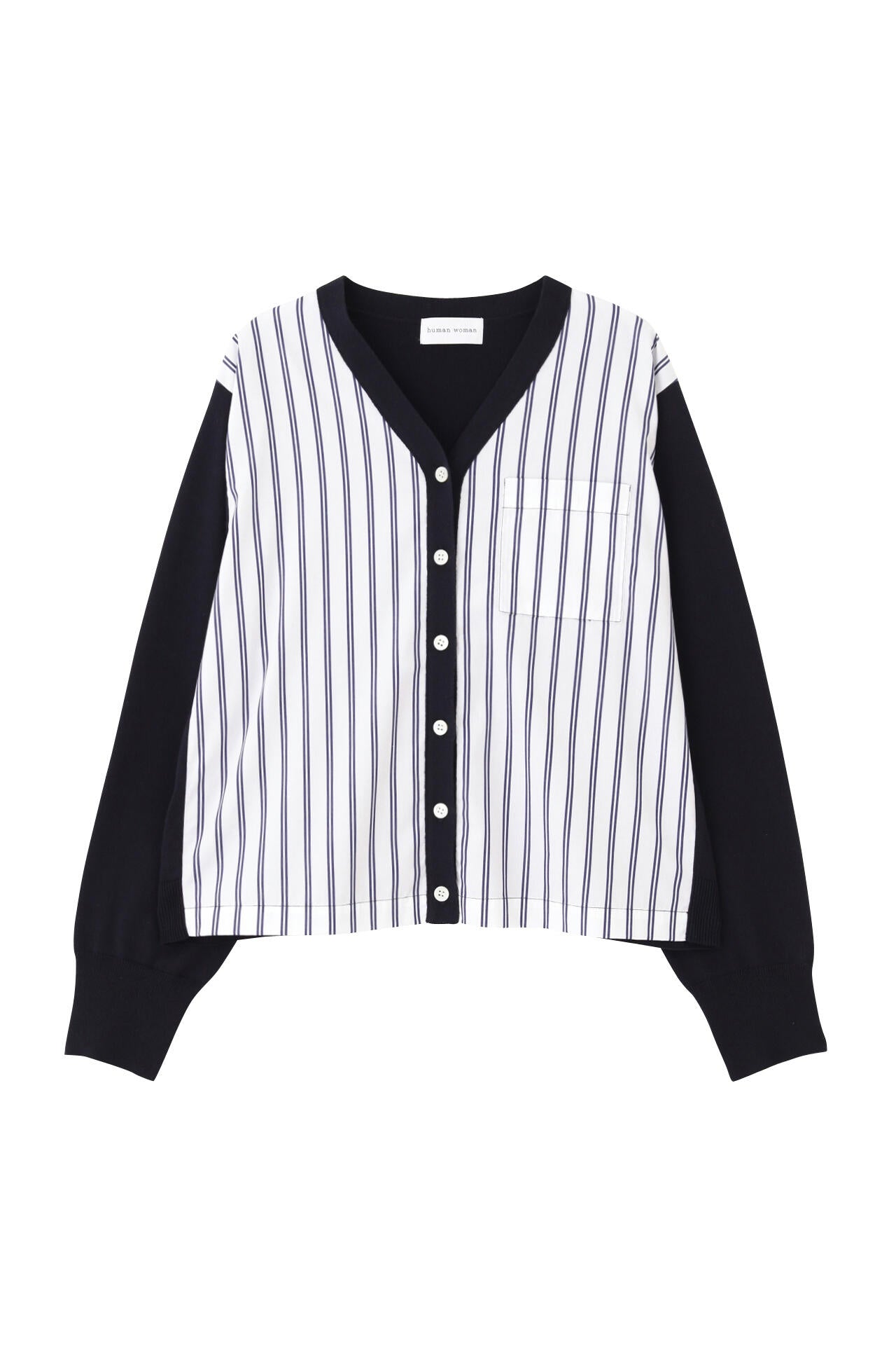 前身頃をストライプ柄の布帛に切り替えたVネックカーディガンです。3色それぞれ異なったストライプ柄を使用しました。