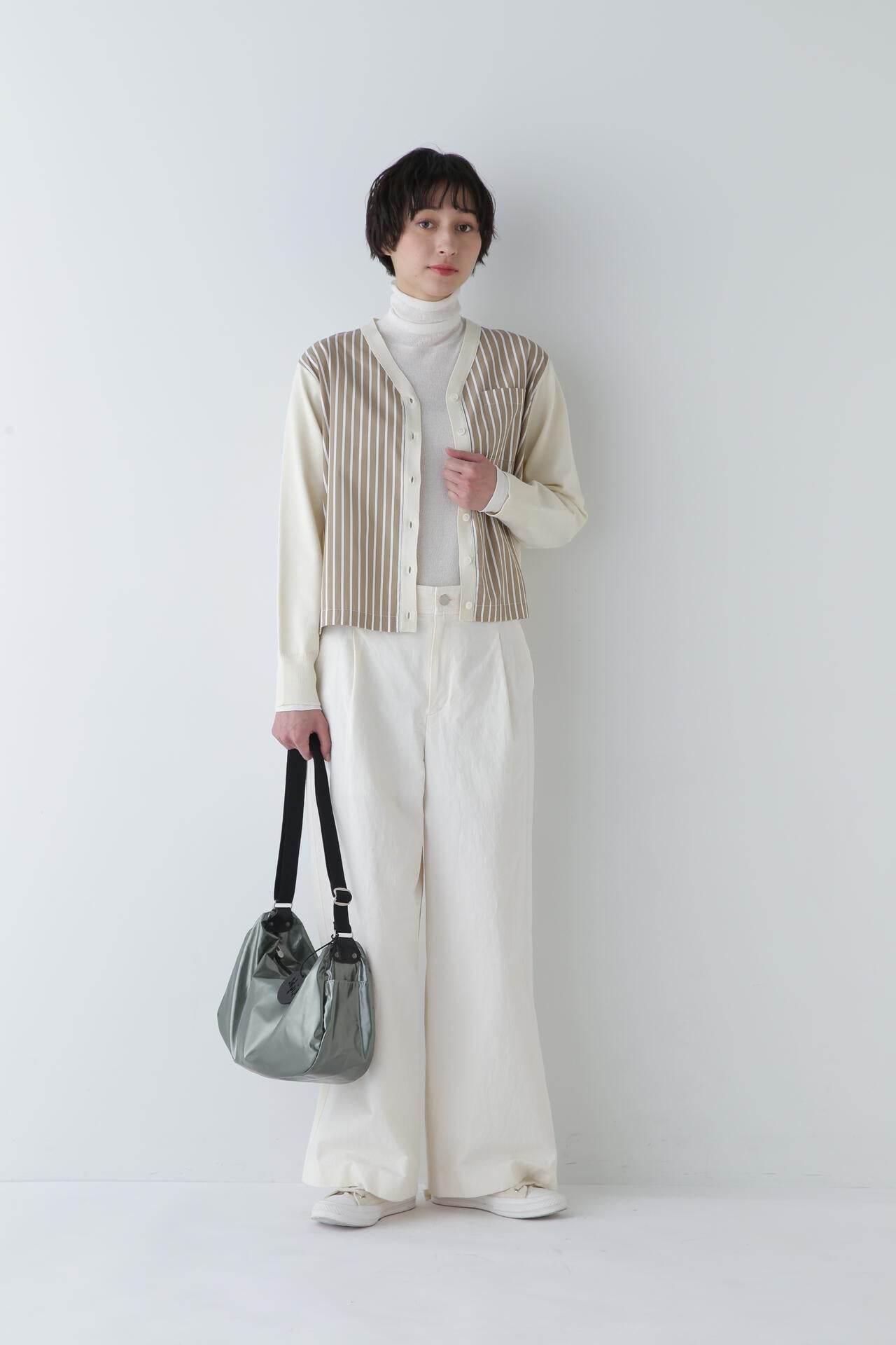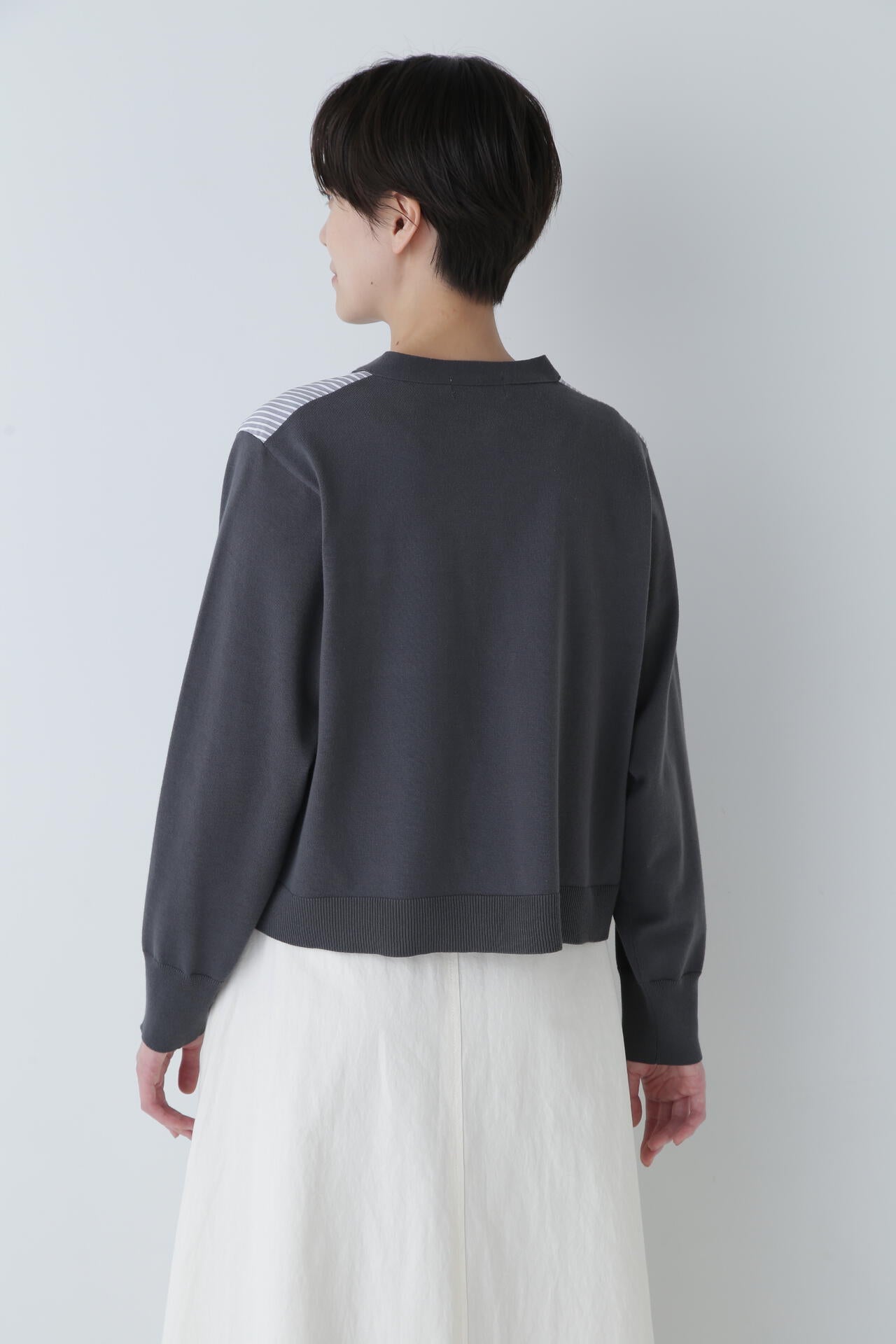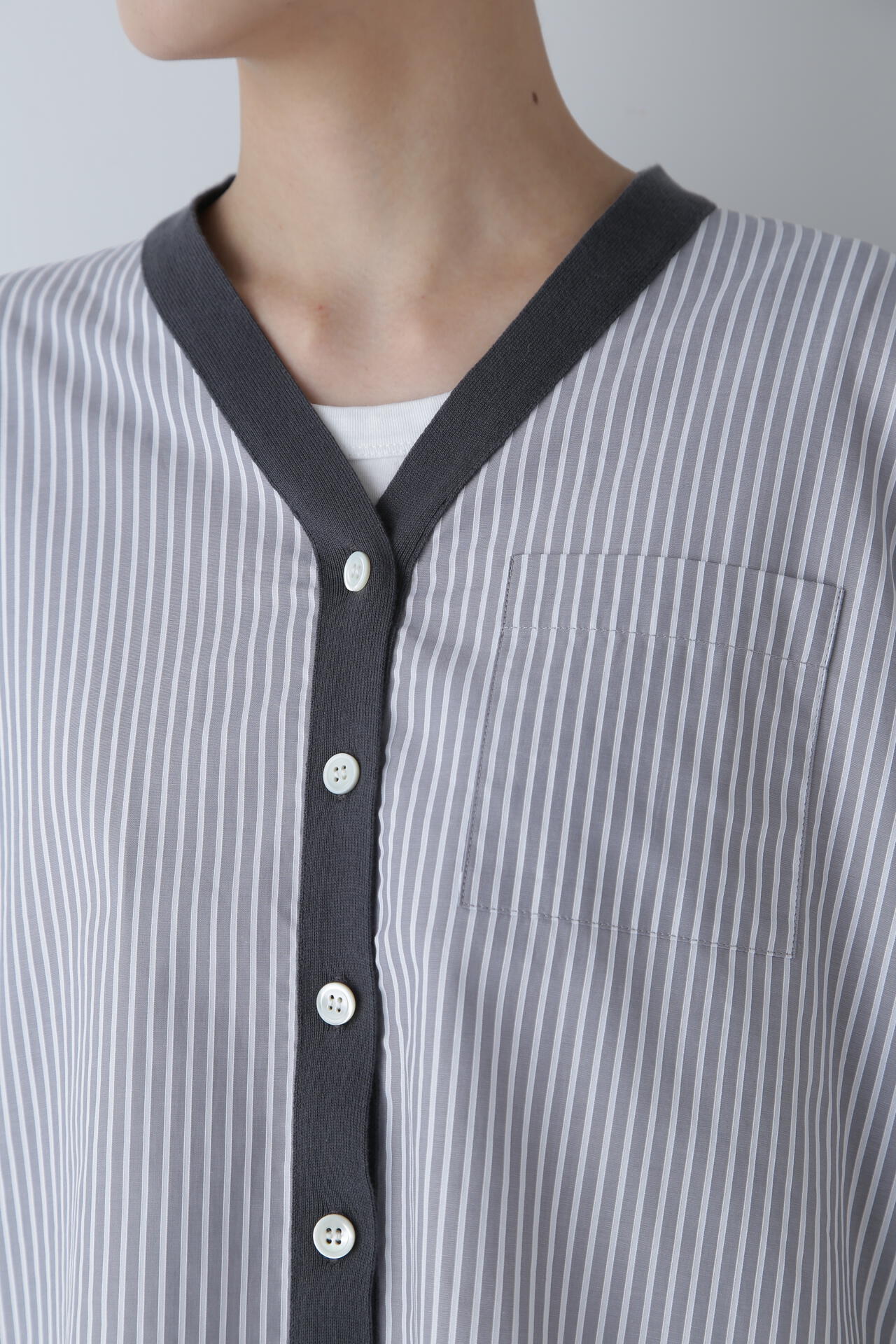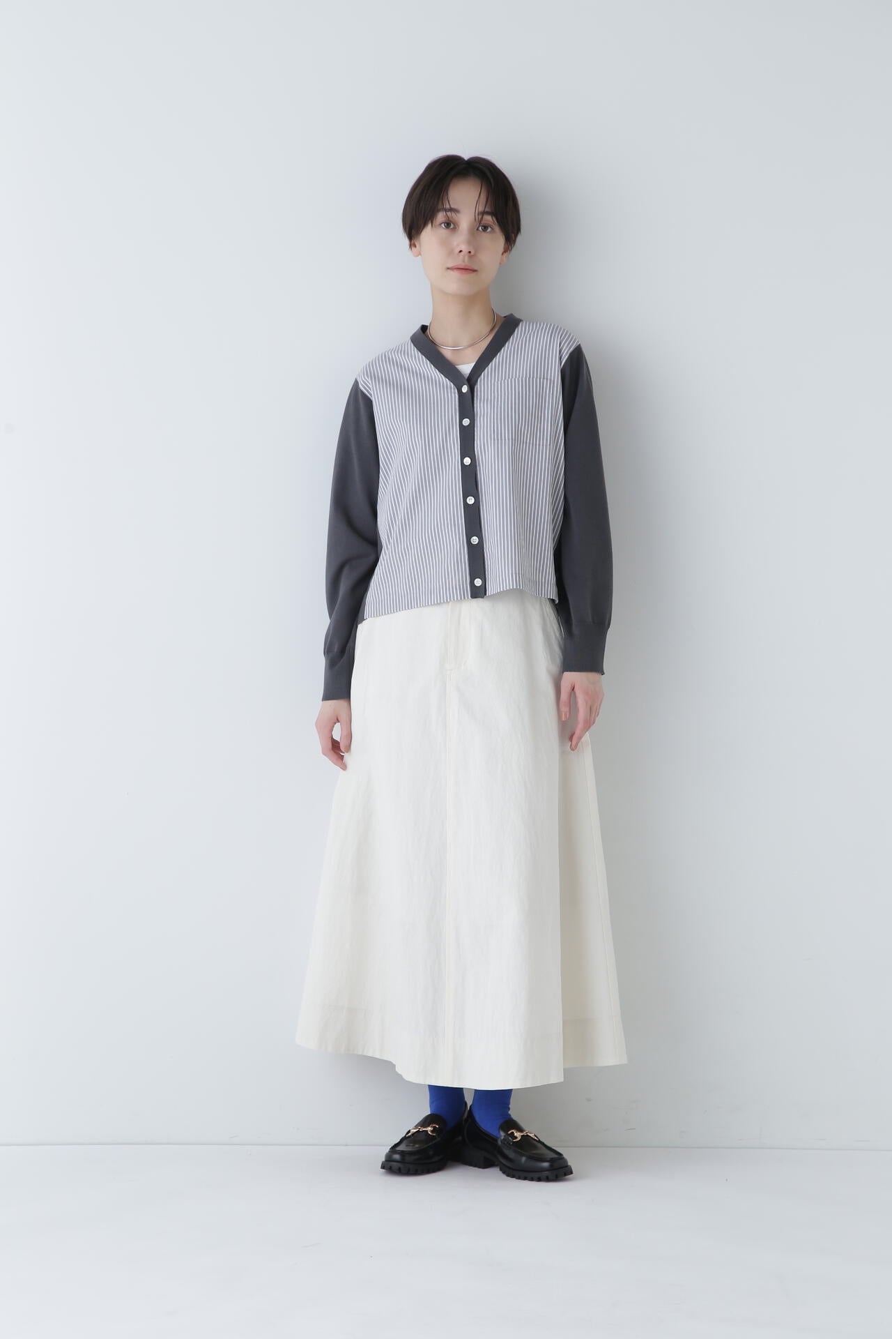前身頃をストライプ柄の布帛に切り替えたVネックカーディガンです。3色それぞれ異なったストライプ柄を使用しました。