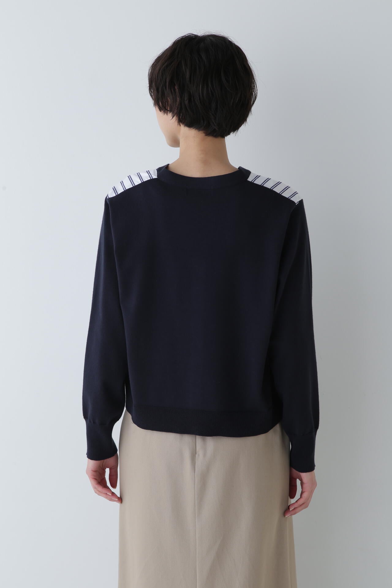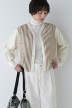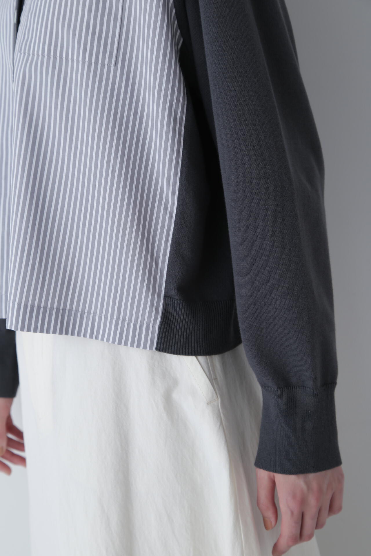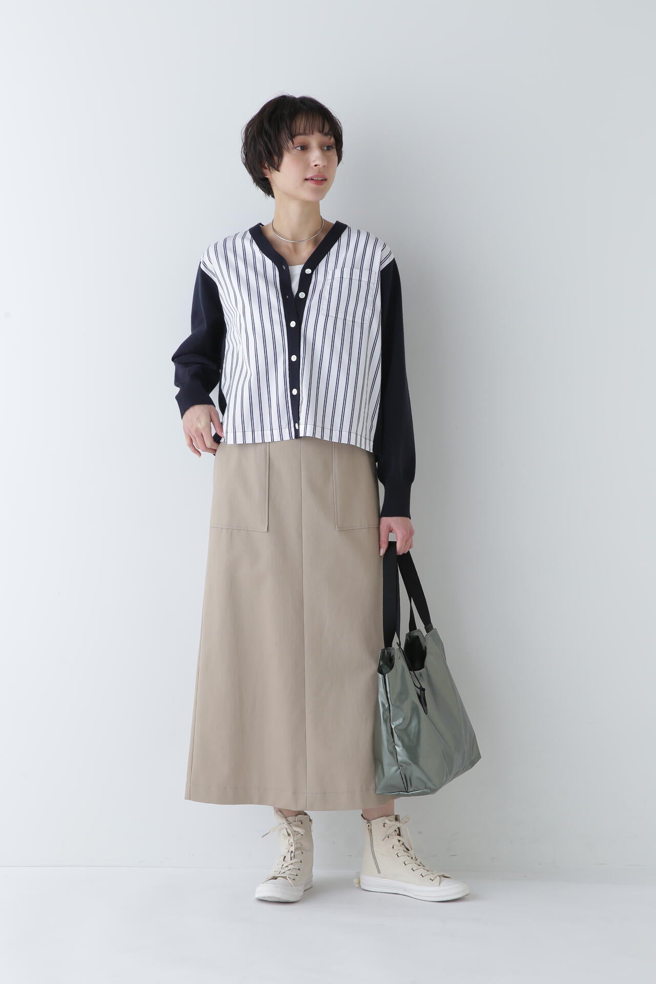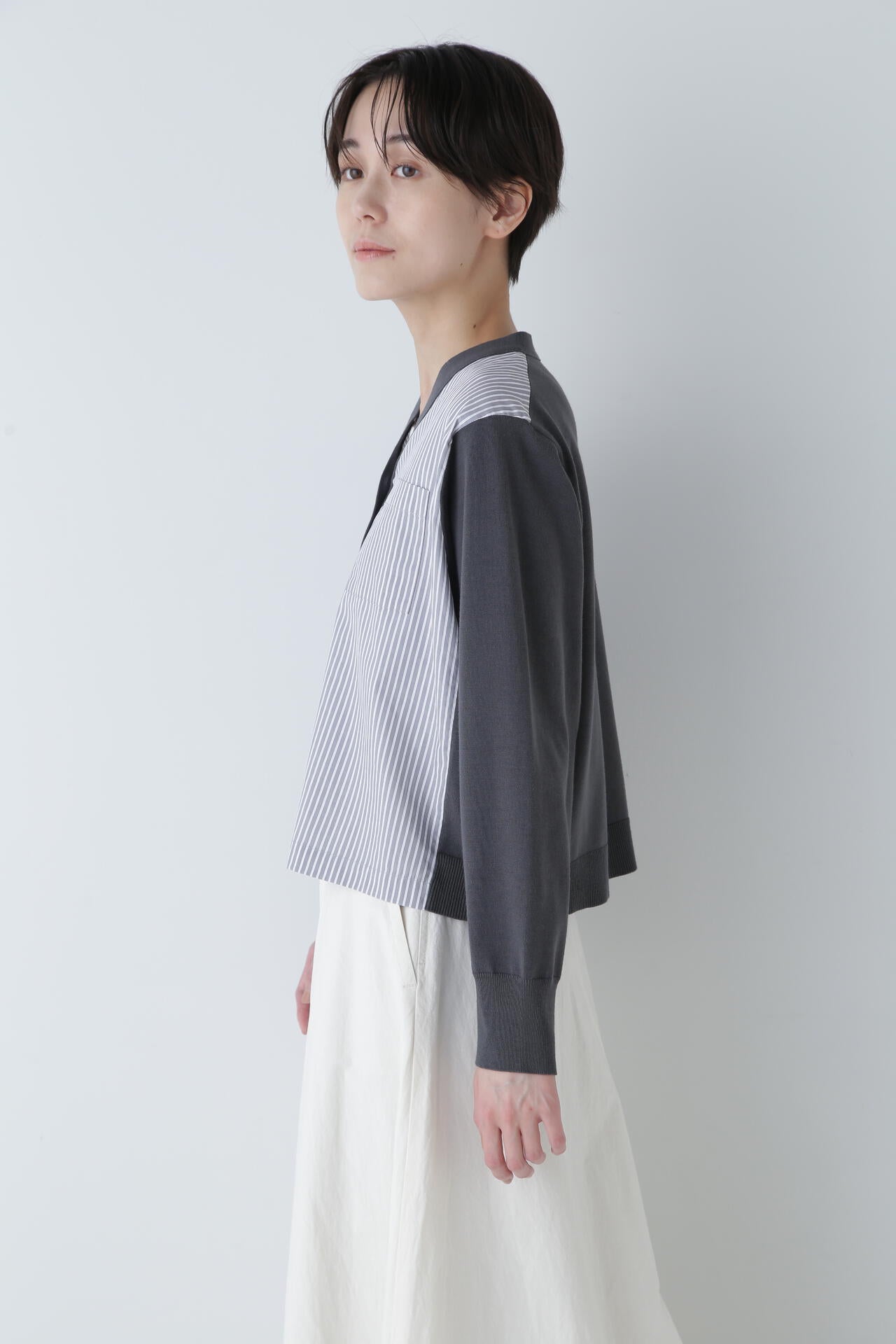 前身頃をストライプ柄の布帛に切り替えたVネックカーディガンです。3色それぞれ異なったストライプ柄を使用しました。