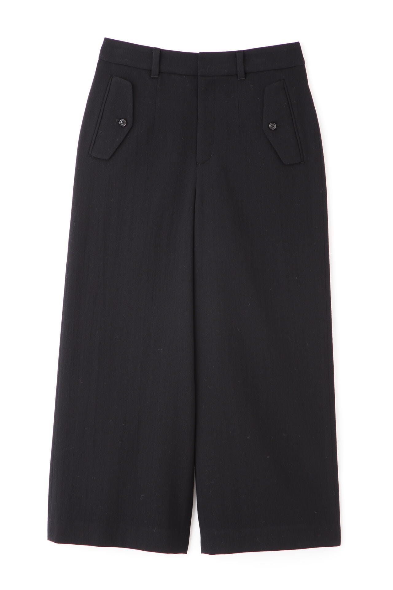 前に見えてくる両玉縁フラップポケットがポイントのガウチョパンツです。フラップは中にしまうことができ、スッキリ両玉縁ポケットの見え方でも着用いただけます。